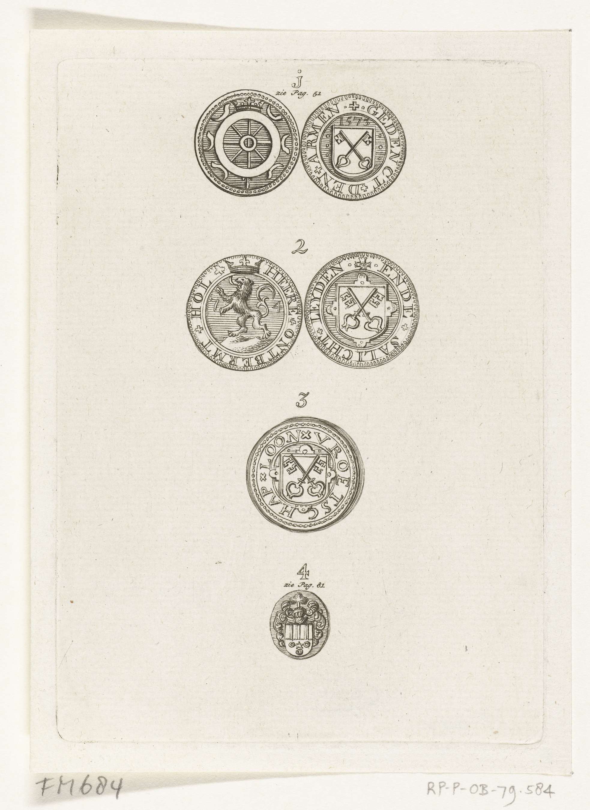 Vier noodmunten en -penningen uit beleg van Leiden, 1573-1574. Genummerd 1-4 en met verwijzingen naar paginanummers.