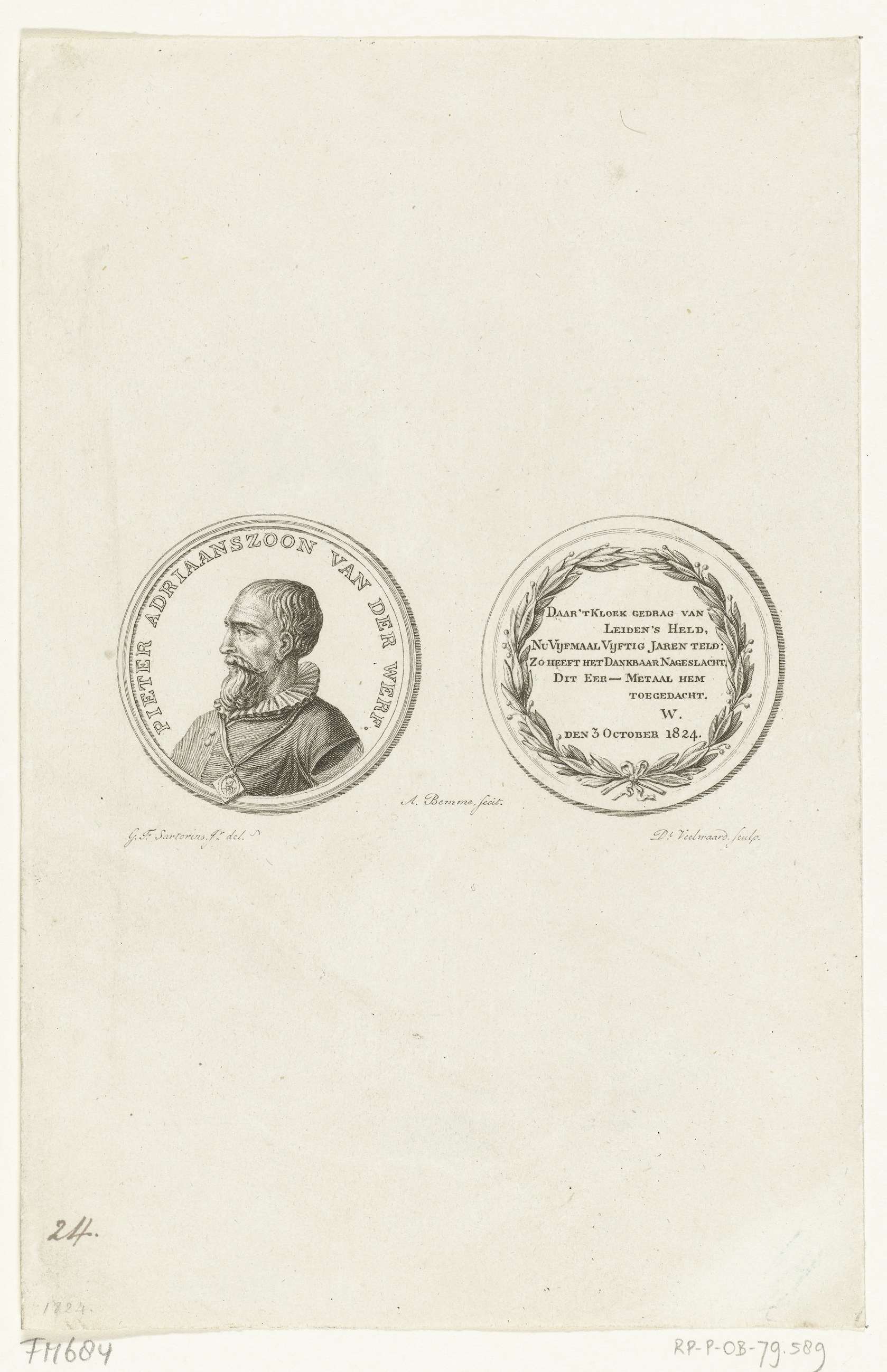 Penning van de stad Leiden, ter ere van Pieter Adriaansz. van der Werff van 1824, 250 jaar na het ontzet van Leiden van 1574. Voorzijde: borstbeeld van Van der Werff binnen omschrift. Keerzijde: Vers binnen lauwerkrans.