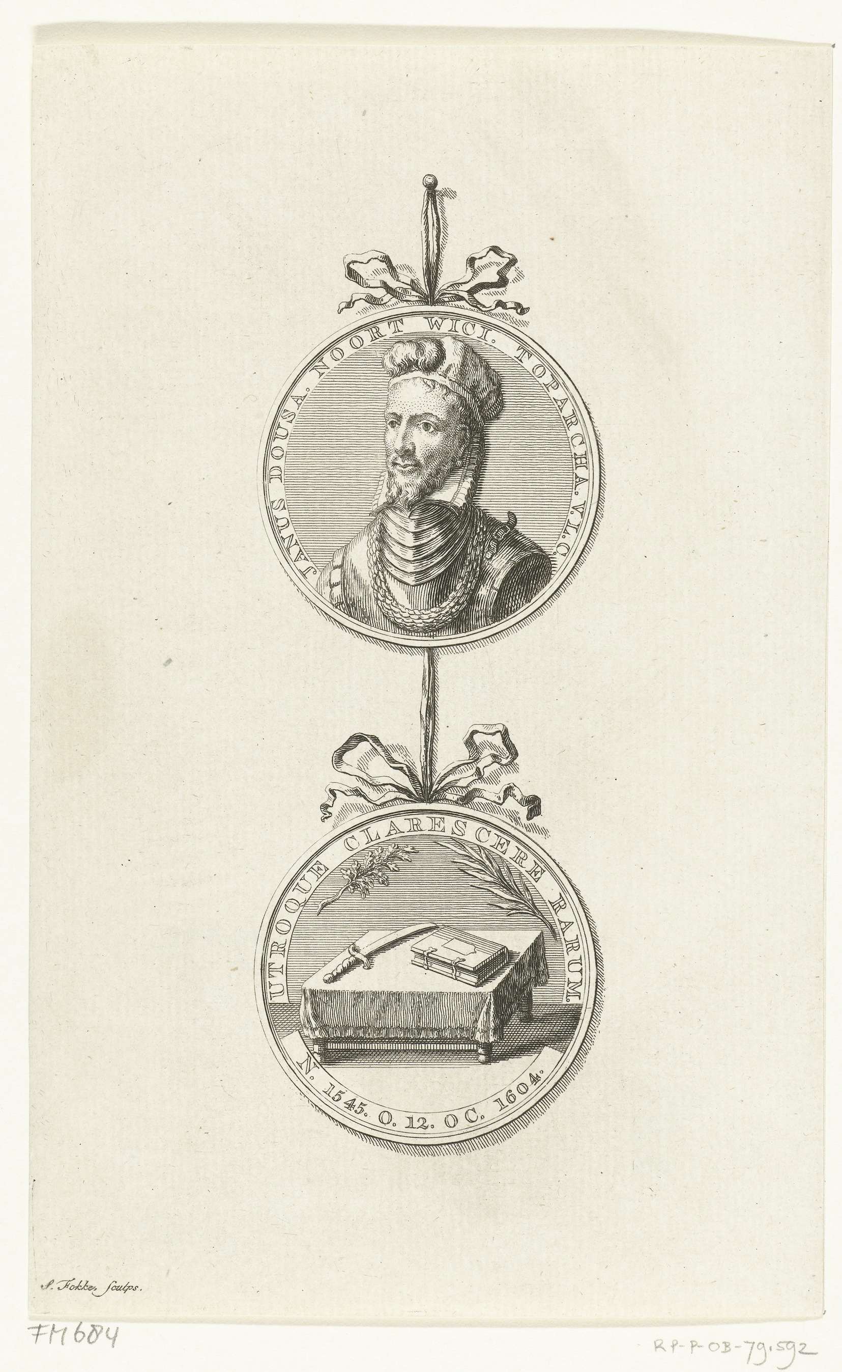 Penning met portret van Johan van der Does, heer van Noordwijk, bevelhebber te Leiden tijdens het beleg, 1574. Bij zijn overlijden in 1604. Zilveren penning. Voorzijde: borststuk man binnen omschrift. Keerzijde: zwaard en boek liggend op een tafel onder een eiken- en een olijftak binnen omschrift. Voor- en keerzijde onder elkaar hangend aan lint.