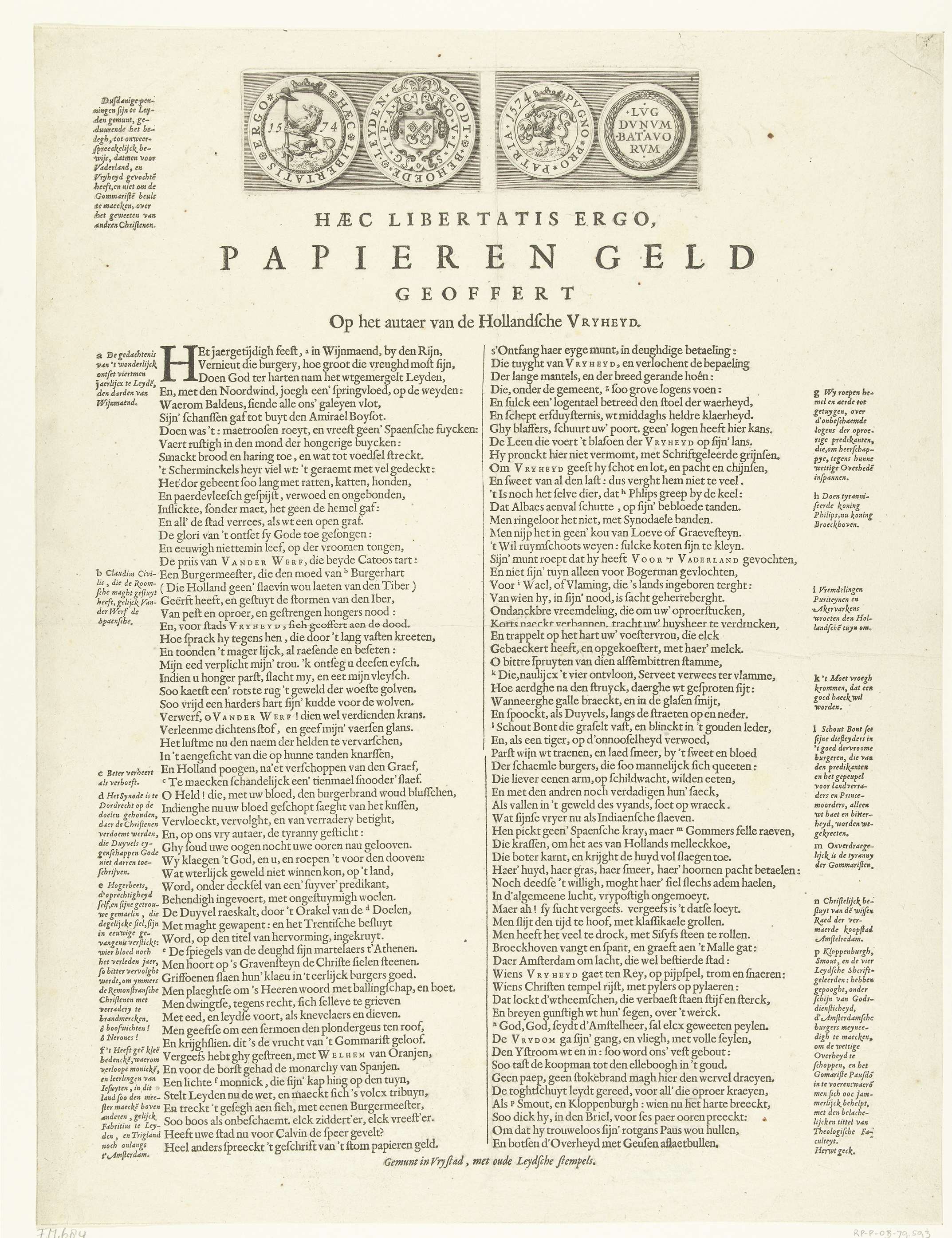 Blad met lofdicht uit 1630 op het papieren noodgeld uit het beleg van Leiden, 1574. Twee papieren noodmunten uit het beleg van Leiden, 1574. Voorzijde leeuw met lans en vrijheidshoed en leeuw met zwaard en wapen van Leiden, keerzijde wapen van Leiden en opschrift in Latijn. Onder de voorstelling een lang vers in 2 kolommen ...