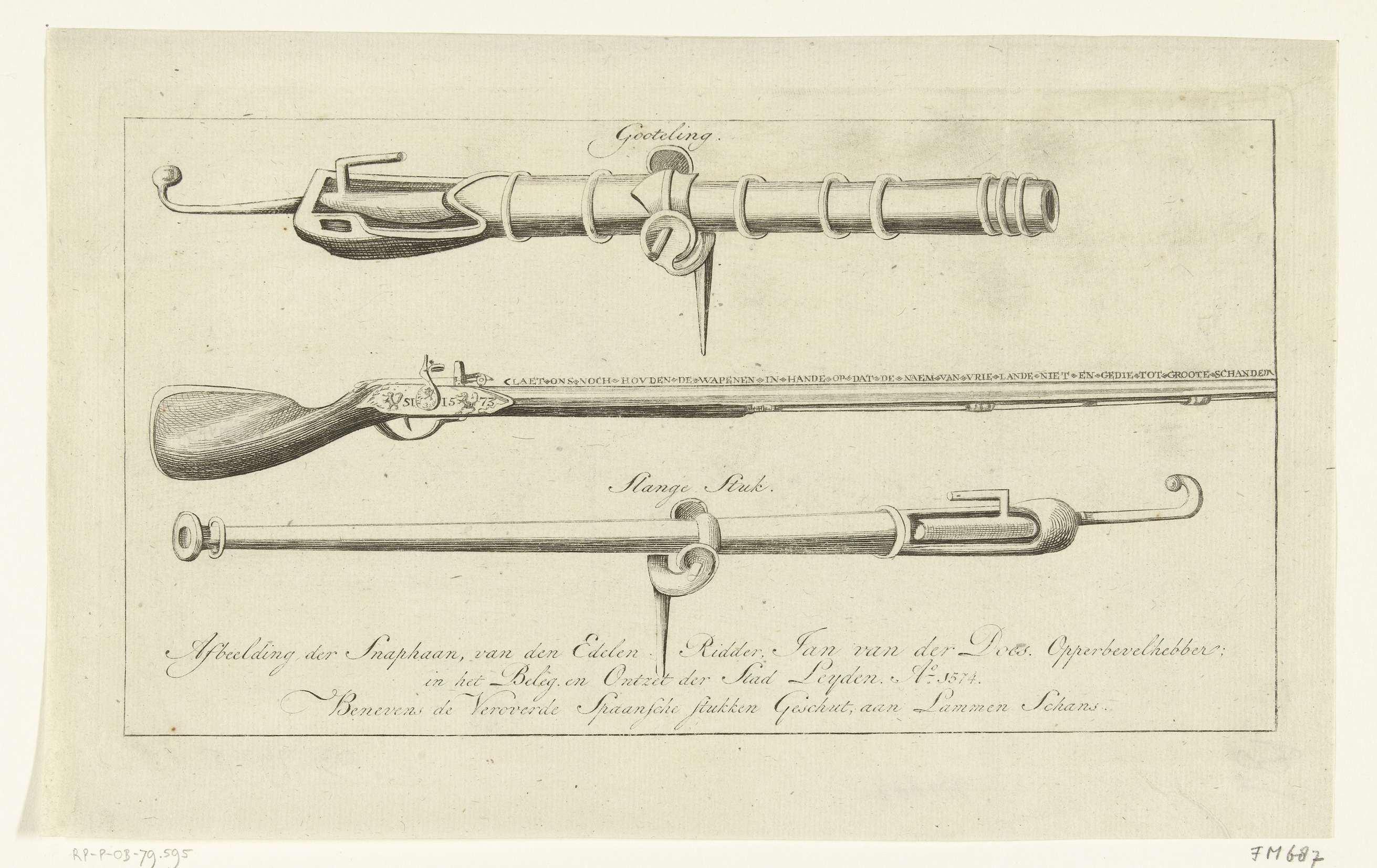 Snaphaan van Johan van der Does en twee buitgemaakte stukken Spaanse geschut, tijdens het beleg van Leiden in 1574. het bovenste stuk aangeduid als: Gooteling, het onderste als: Slange Stuk. Het geweer van Van der Does gemerkt 1573 en met de transcriptie van de inscriptie op de loop.