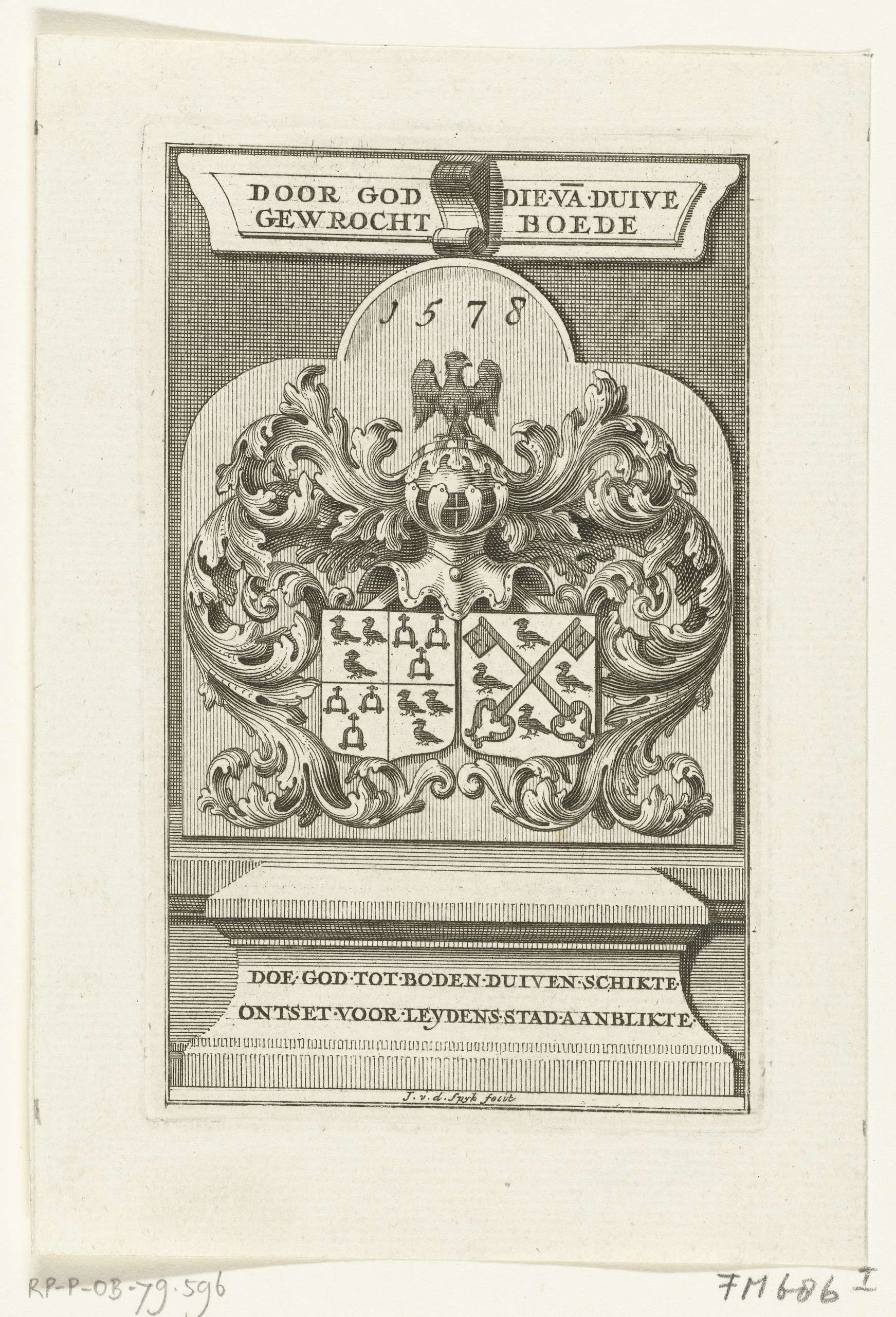 Wapen van de Leidse organist Willem Cornelisz. die in 1578 het recht verwierf om zich Van Duyvenbode te noemen. Dit als beloning voor het inzetten van zijn duiven als postduiven voor communicatie tijdens het beleg tussen het stadsbestuur van Leiden en de troepen van de prins van Oranje.