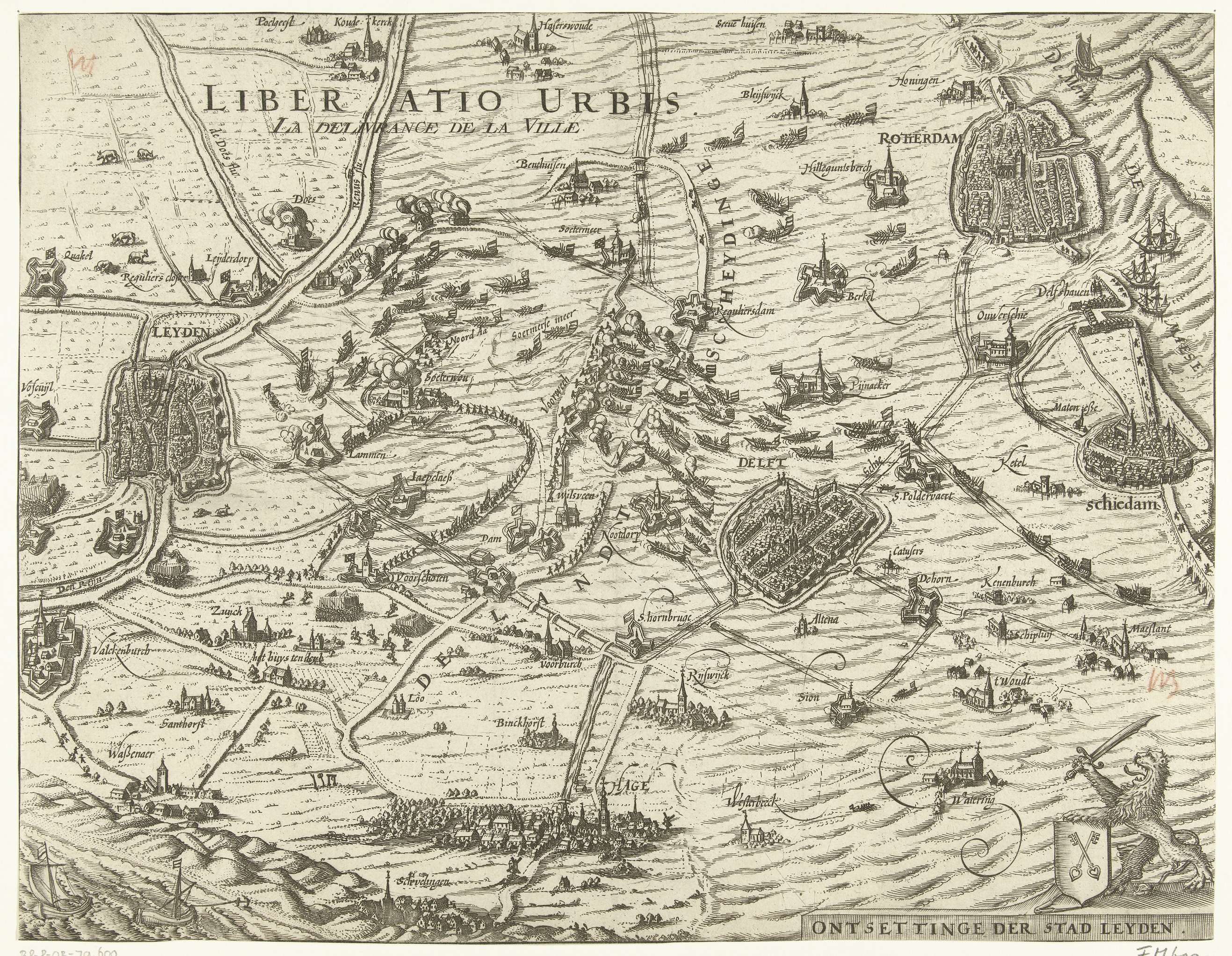 Kaart met het ontzet van Leiden, 3 oktober 1574. Rechtsboven Rotterdam, Schiedam en Delft, links Leiden, onderaan Den Haag. Rechtsonder de Hollandse Leeuw met getrokken zwaard en het stadswapen van Leiden.