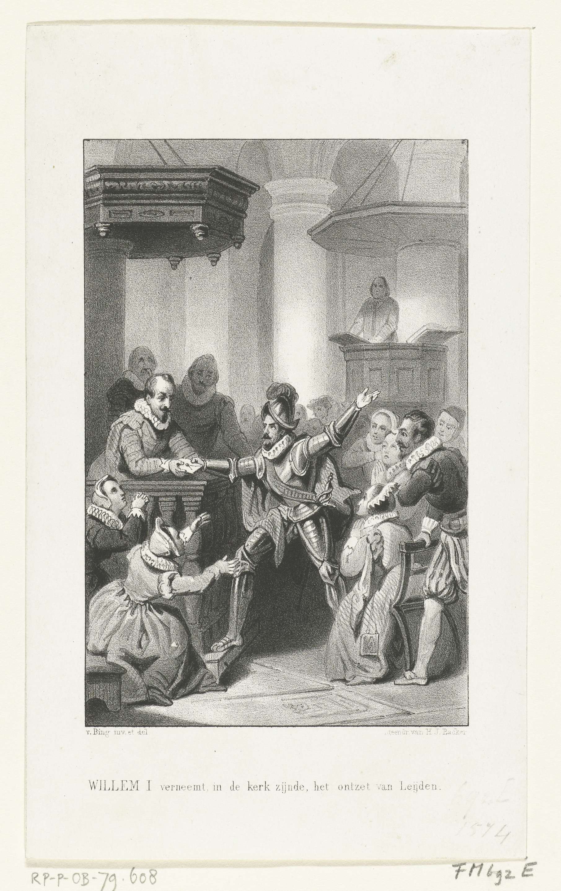 Willem van Oranje verneemt tijdens een kerkdienst het nieuws van het ontzet van Leiden, 3 oktober 1574. Een soldaat in harnas overhandigt de prins een verzegelde envelop.
