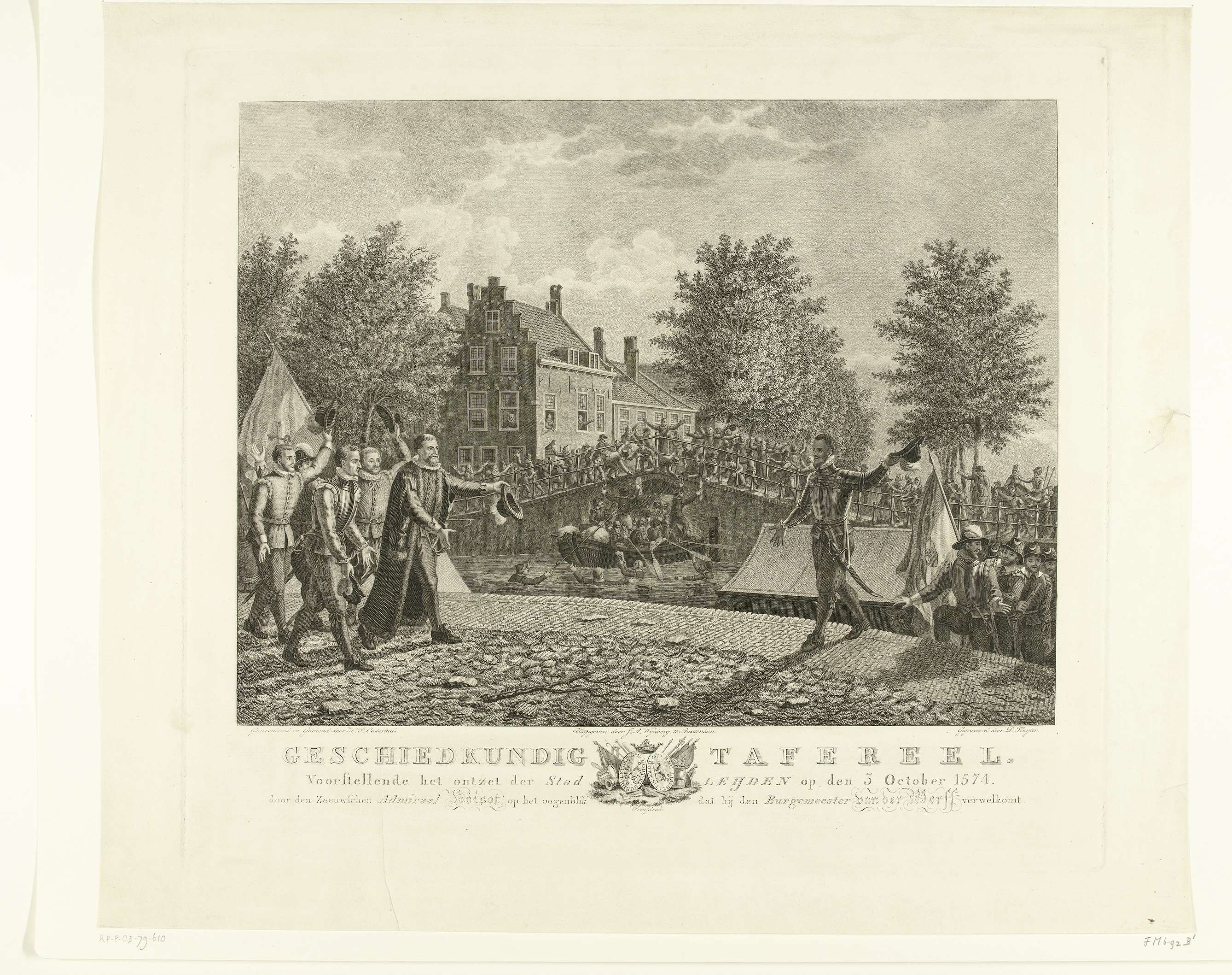 Louis de Boisot verwelkomt burgemeester Pieter van der Werff op de kade tijdens het ontzet van Leiden, 3 oktober 1574. Op de achtergrond delen de geuzen vanuit bootjes brood uit aan de uitgehongerde bevolking van de stad.