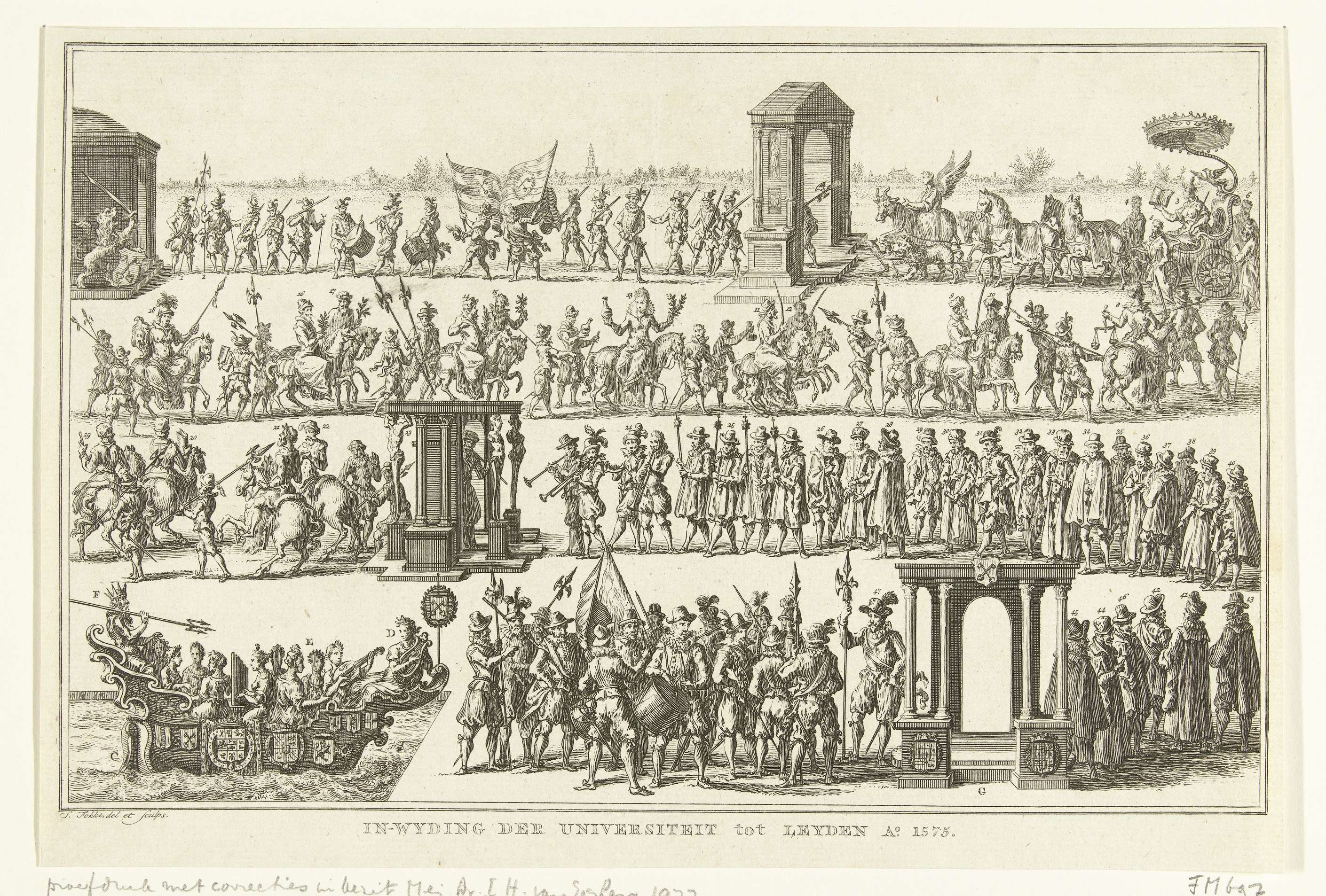 Optocht bij de inwijding van Universiteit van Leiden, 8 februari 1575. Stoet in vier rijen boven elkaar afgebeeld. Linksonder het schip met Apollo, Neptunus en de negen muzen. Verder soldaten, muzikanten, allegorische figuren die de wetenschappen verbeelden, hoogwaardigheidsbekleders, stadsboden en professoren. Figuren en onderdelen in de voorstelling zijn aangeduid met cijfers en letters.