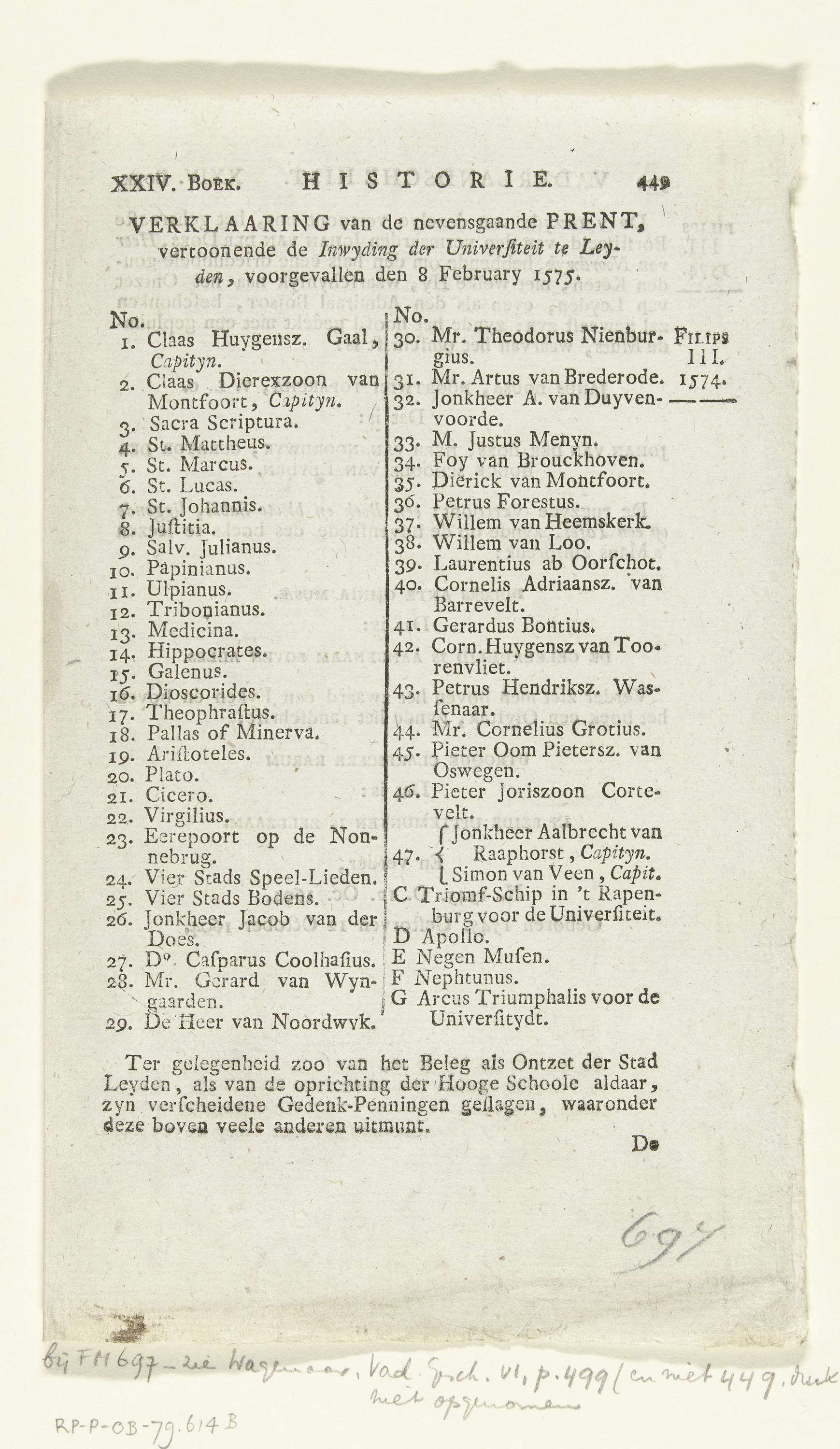 Legenda behorend bij de prent met de optocht bij de inwijding van Universiteit van Leiden, 8 februari 1575. Gevouwen blad waarvan alleen de eerste twee bladzijden bedrukt zijn. Lijst in 2 kolommen, 1-47 en A-G.