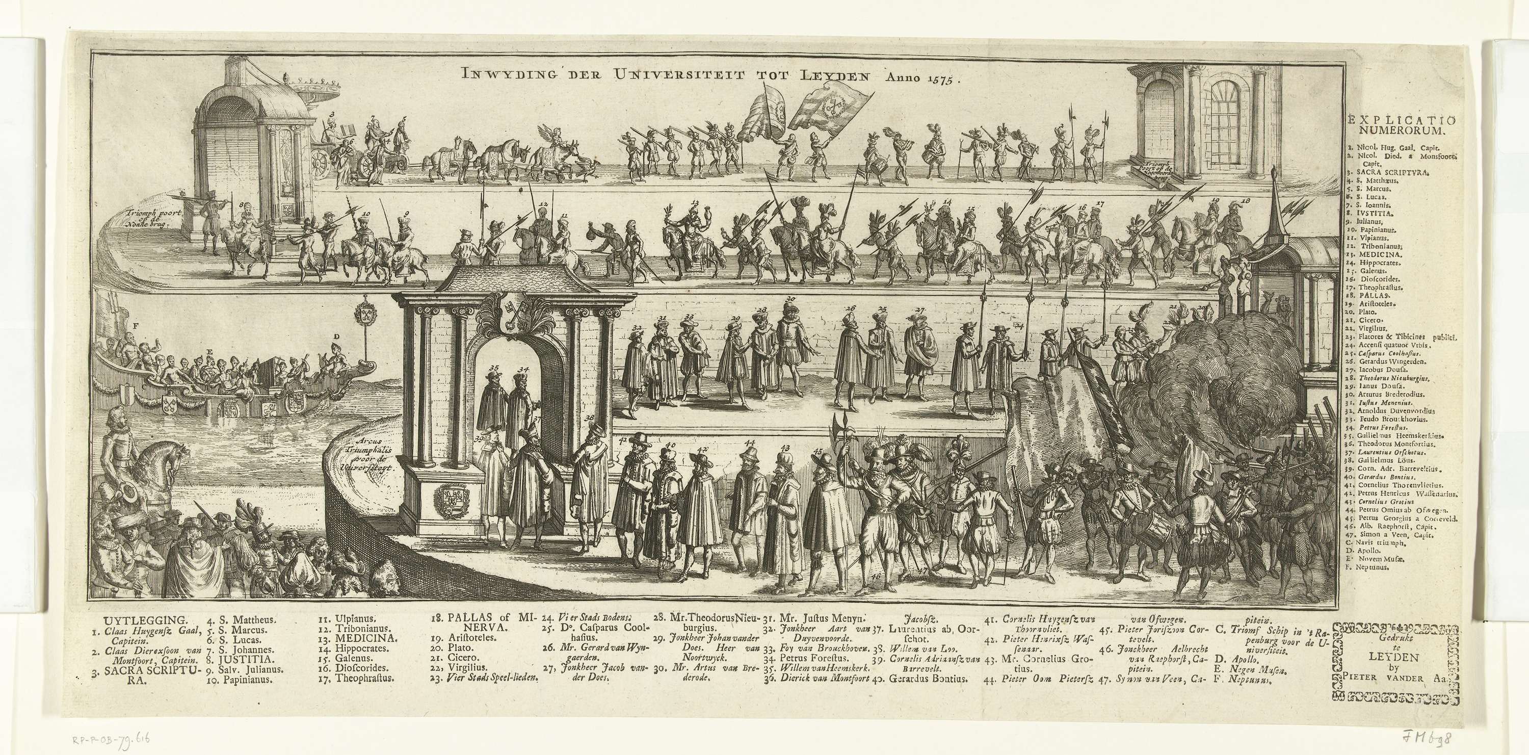 Optocht bij de inwijding van Universiteit van Leiden, 8 februari 1575. Stoet in drie rijen boven elkaar afgebeeld. Rechtsonder soldaten, muzikanten, vaandeldragers en vreugdeschoten. Links lopen hoogwaardigheidsbekleders en professoren door een triomfpoort met het wapen van Leiden. Linksonder het schip met Neptunus, Apollo en de negen muzen. Elementen in de voorstelling aangeduid met cijfers en ...