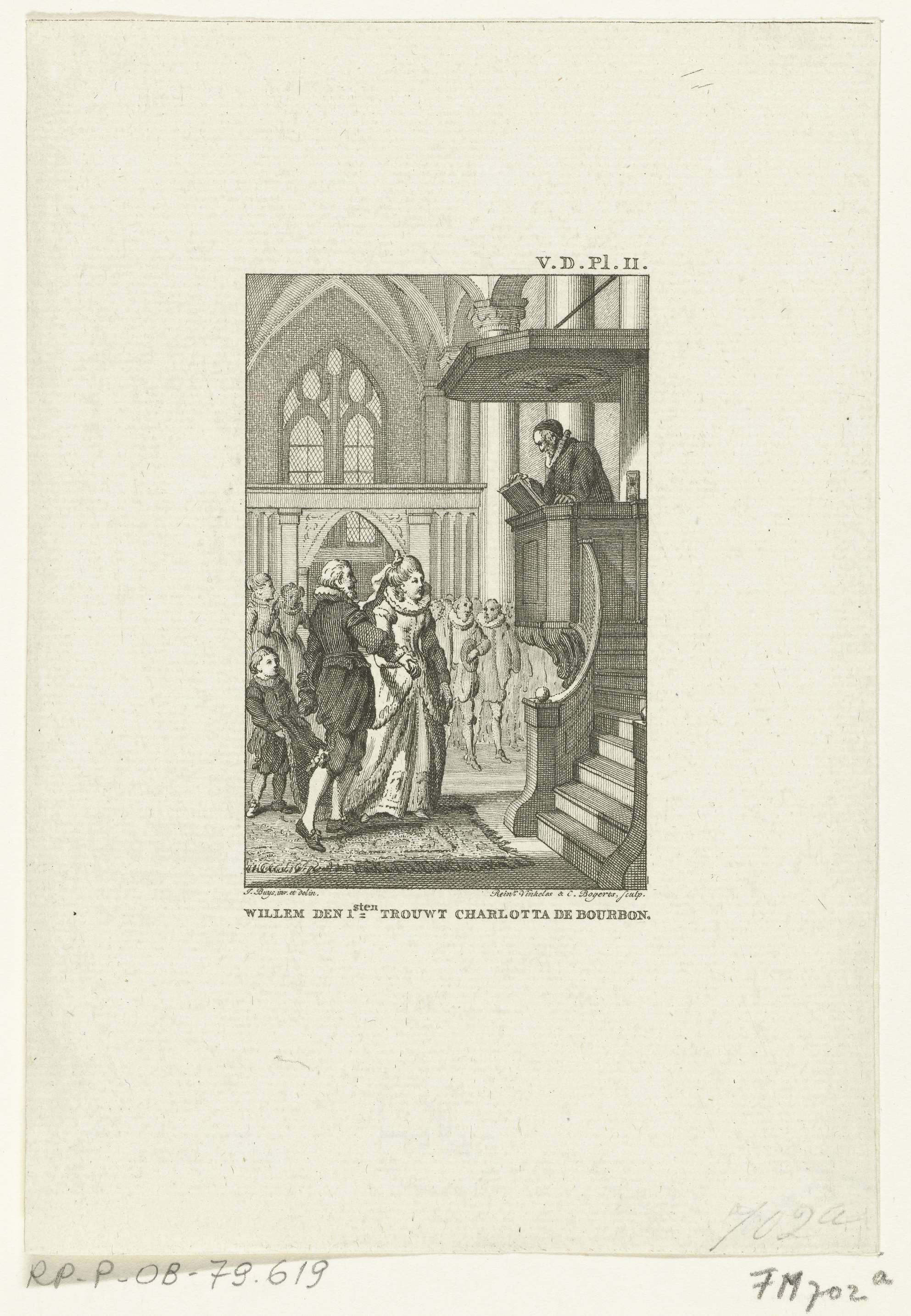 Huwelijk van Willem van Oranje en Charlotte de Bourbon in een kerk te Den Briel, 12 juni 1575. De prins en prinses staande voor een predikant in een preekstoel.