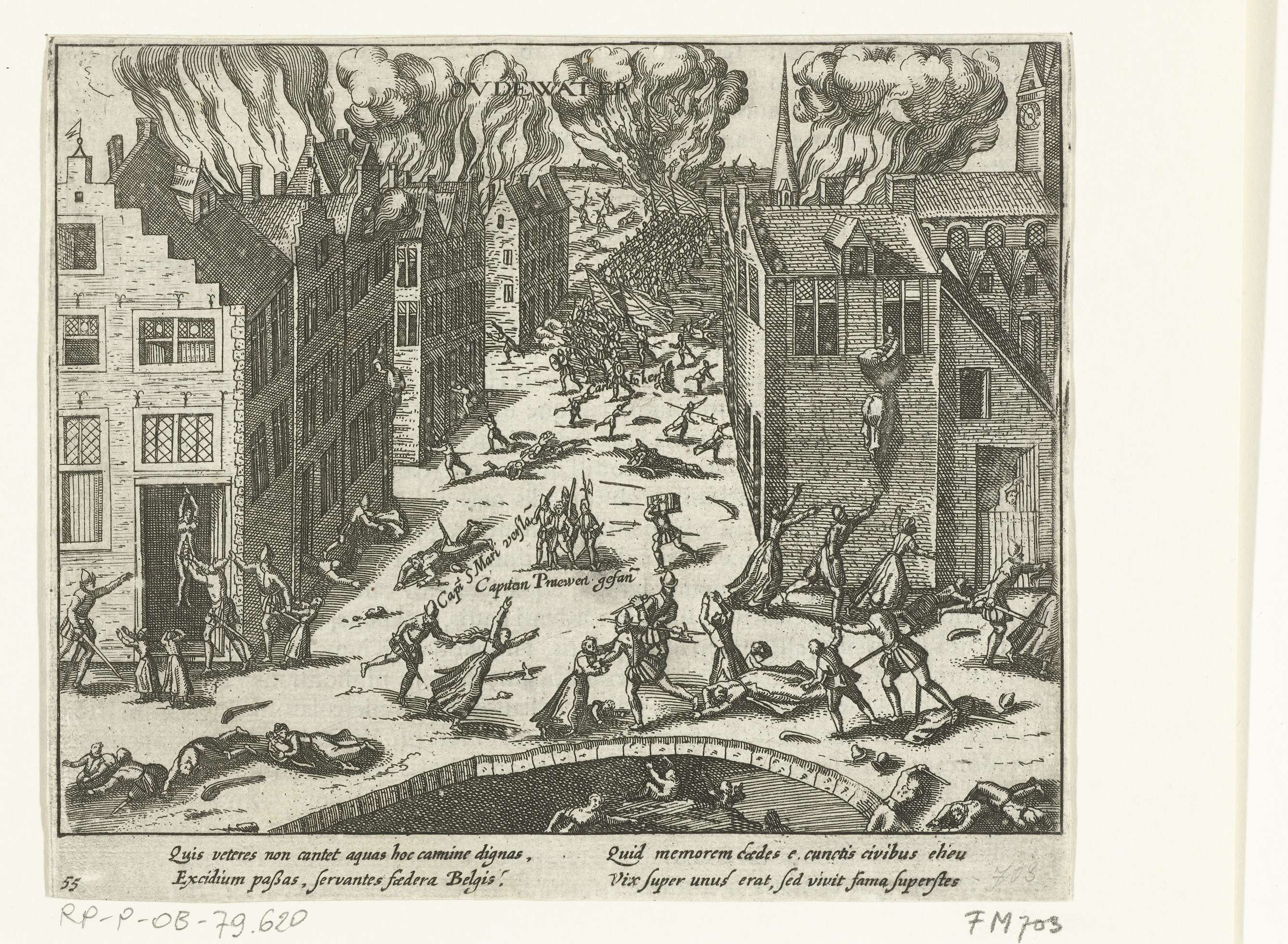 Gruwelijke moordpartij aangericht door de Spaanse soldaten op de bevolking van Oudewater, 8 augustus 1575. De stad wordt geplunderd en in brand gestoken door de soldaten onder bevel van Gilles van Hierges. Met onderschrift van 4 regels in het Latijn. Genummerd: 55. Bedrukt op achterzijde met tekst in het Latijn.