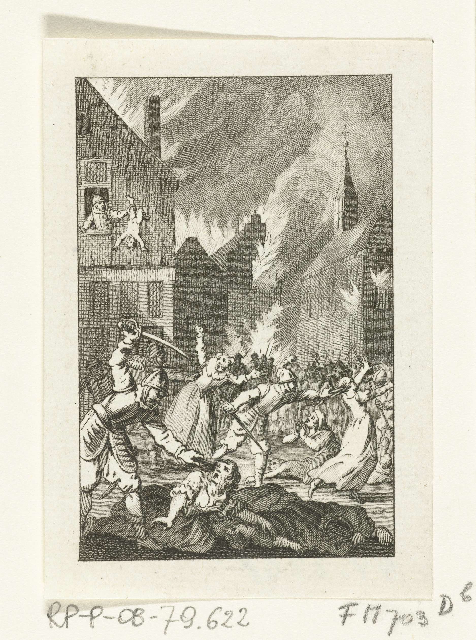 Gruwelijke moordpartij aangericht door de Spaanse soldaten op de bevolking van Oudewater, 8 augustus 1575. De stad wordt geplunderd en in brand gestoken door de soldaten onder bevel van Gilles van Hierges.
