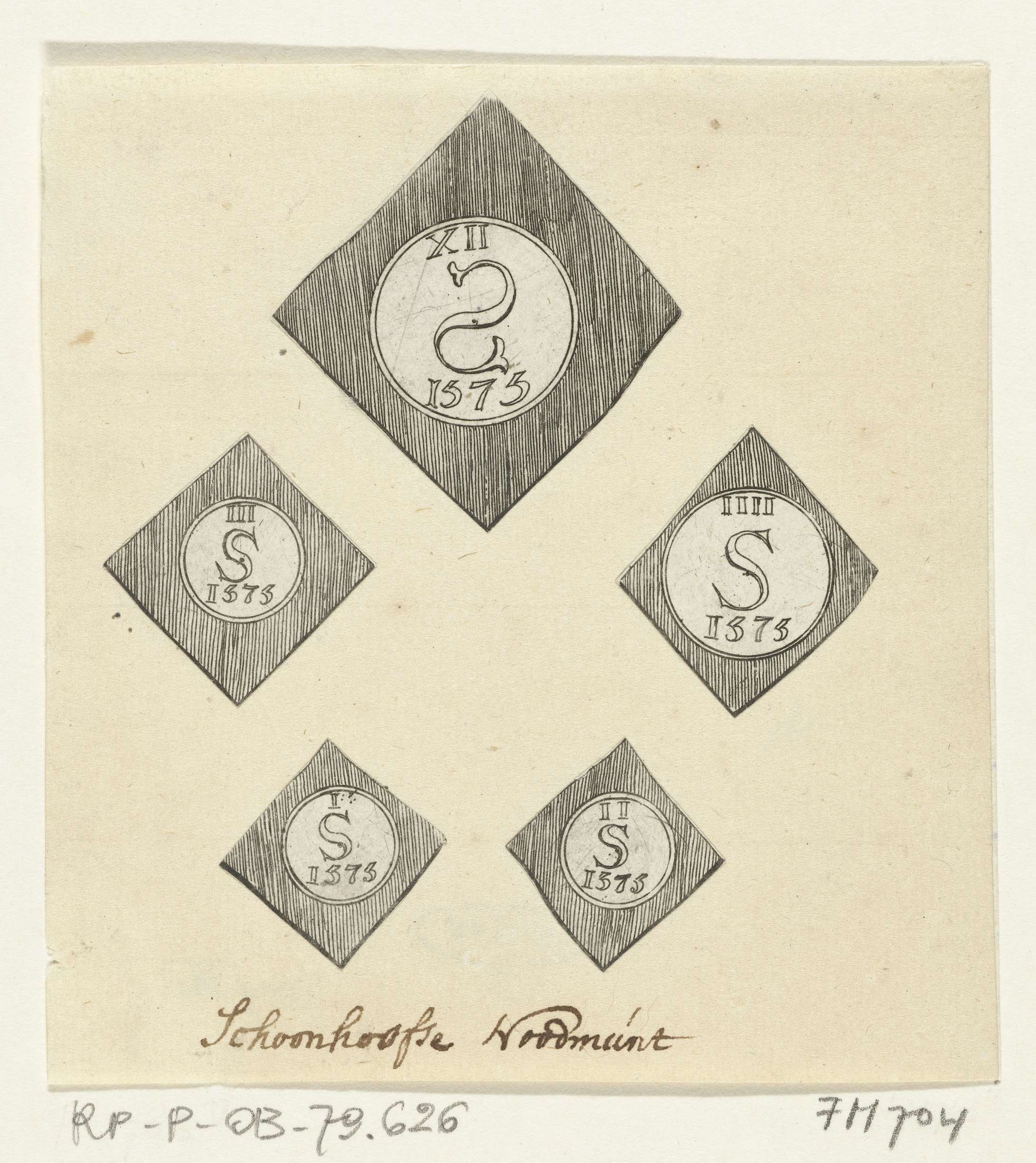 Vijf noodmunten geslagen tijdens het beleg van Schoonhoven, 1575. Op de voorzijde: I-IIII en XXII S 1575. Uitgeknipt en opgeplakt, met handgeschreven opschrift.