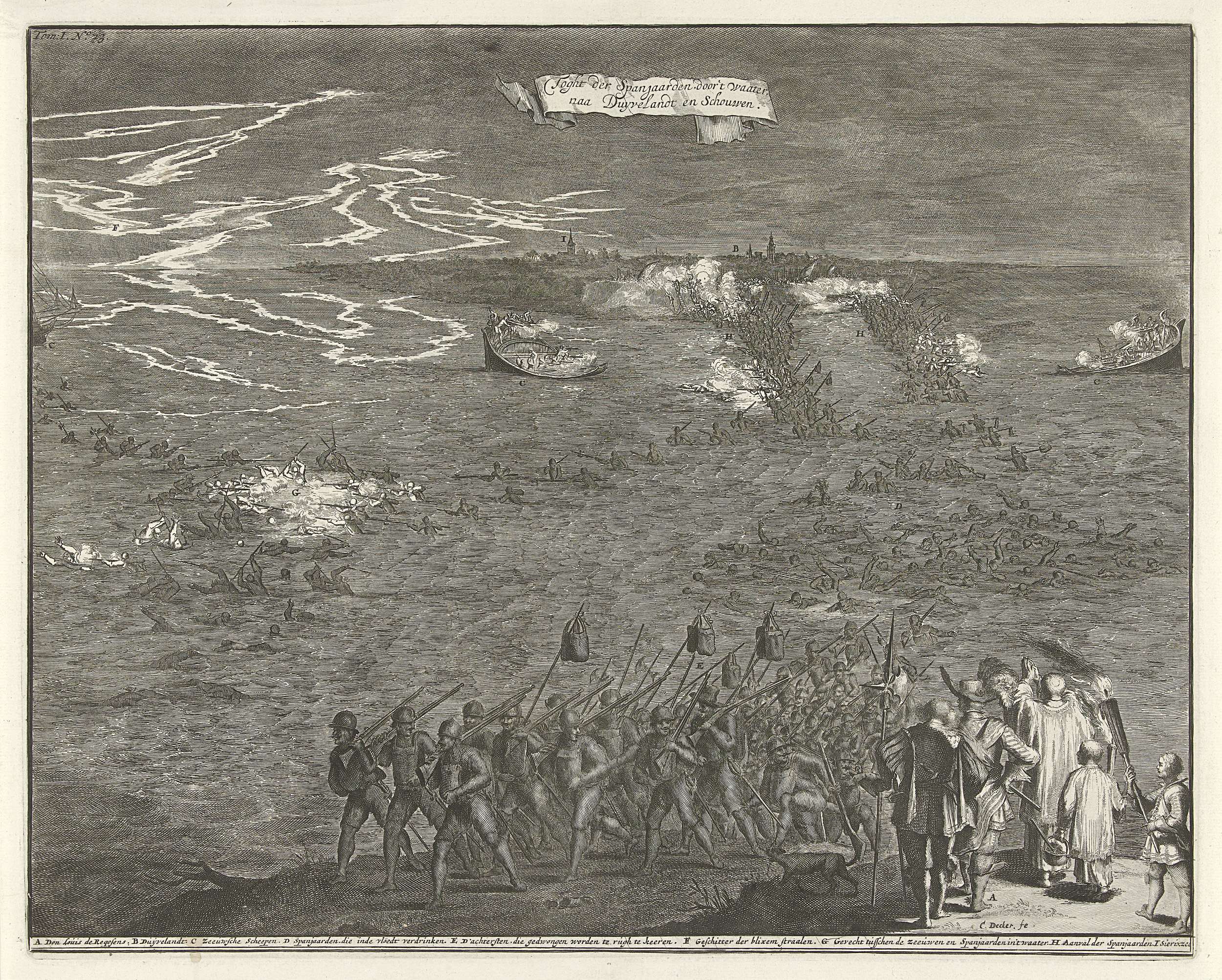 Nachtelijk tocht van Spaanse soldaten door het water naar Duiveland, 1575