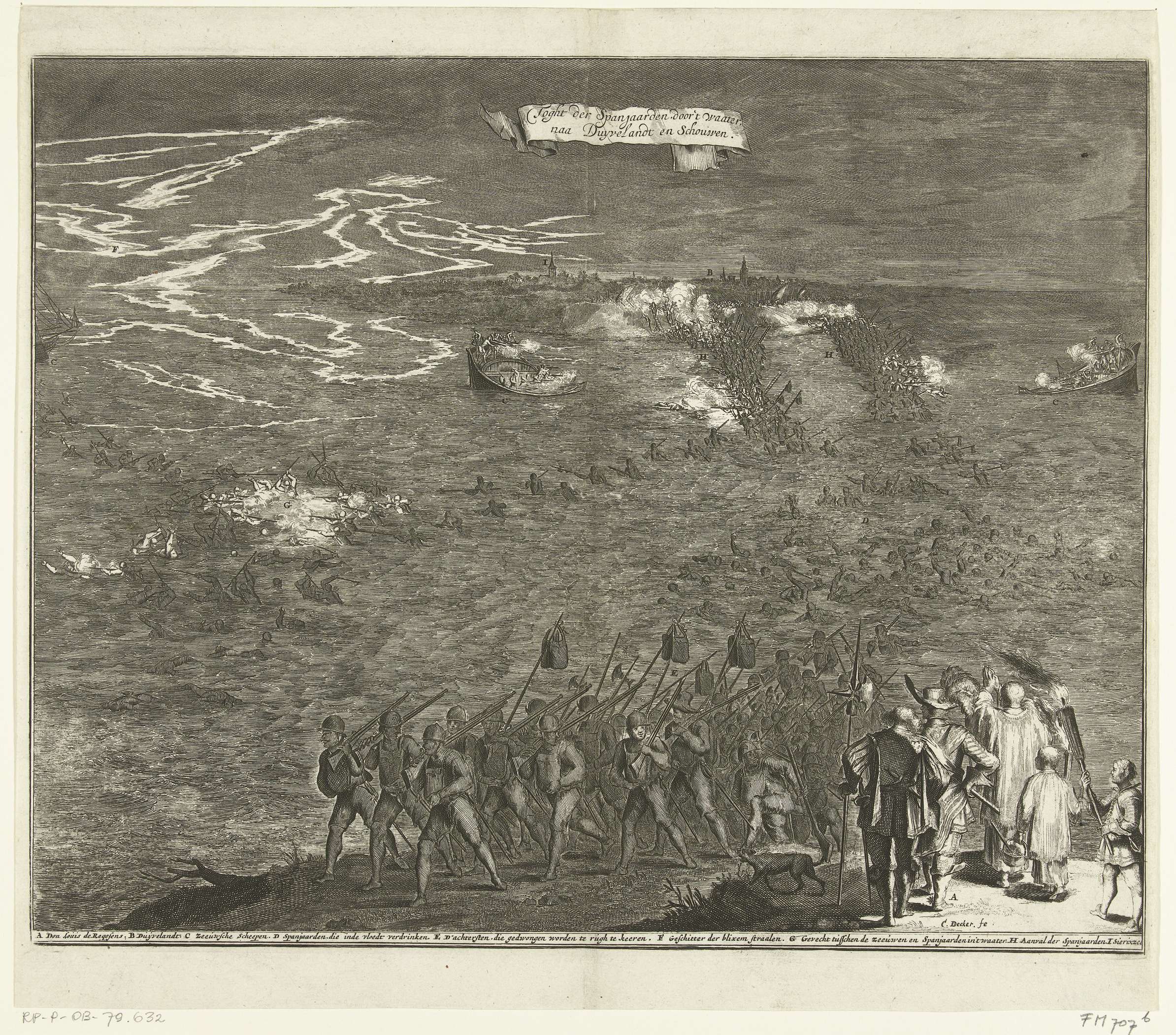 Nachtelijk tocht van Spaanse soldaten van Sint-Philipsland door het water naar het eiland Duiveland, 28 september 1575. Op de voorgrond op Tholen zegent een jezuïet de vertrekkende soldaten, in de verte het eiland Duivenland en Zierikzee. Onderaan de legenda A-I in het Nederlands.