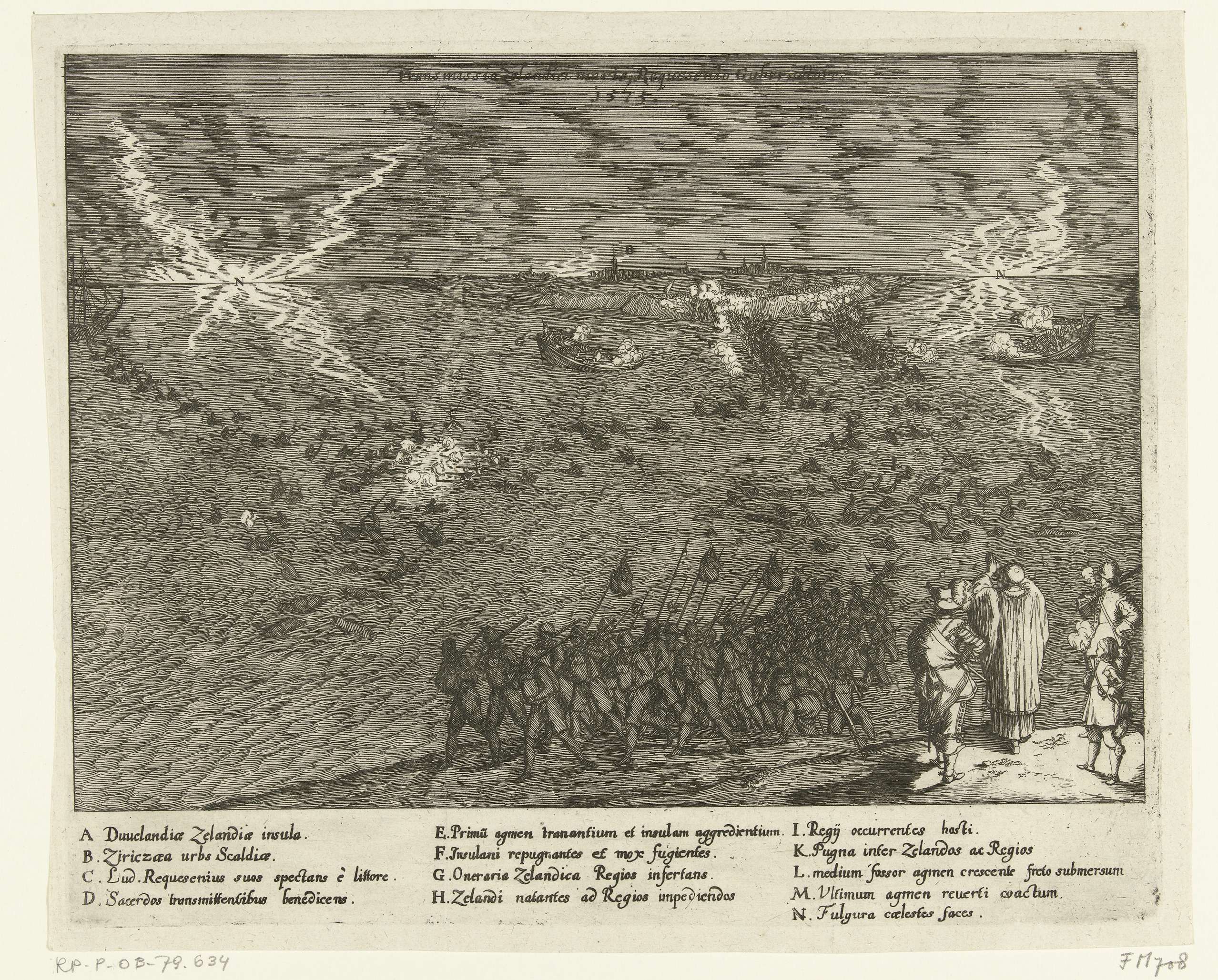 Nachtelijk tocht van Spaanse soldaten van Sint-Philipsland door het water naar het eiland Duiveland, 28 september 1575. Op de voorgrond op Tholen zegent een jezuïet de vertrekkende soldaten, in de verte het eiland Duivenland en Zierikzee. Onderaan de legenda A-N in het Latijn.