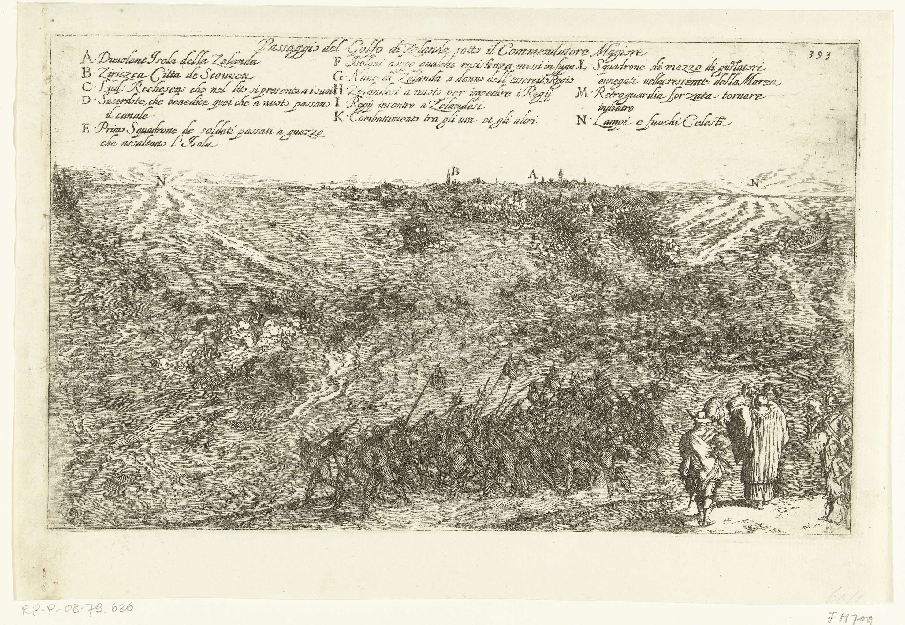 Nachtelijk tocht van Spaanse soldaten van Sint-Philipsland door het water naar het eiland Duiveland, 28 september 1575. Op de voorgrond op Tholen zegent een jezuïet de vertrekkende soldaten, in de verte het eiland Duivenland en Zierikzee. Bovenaan de legenda A-N in het Italiaans.