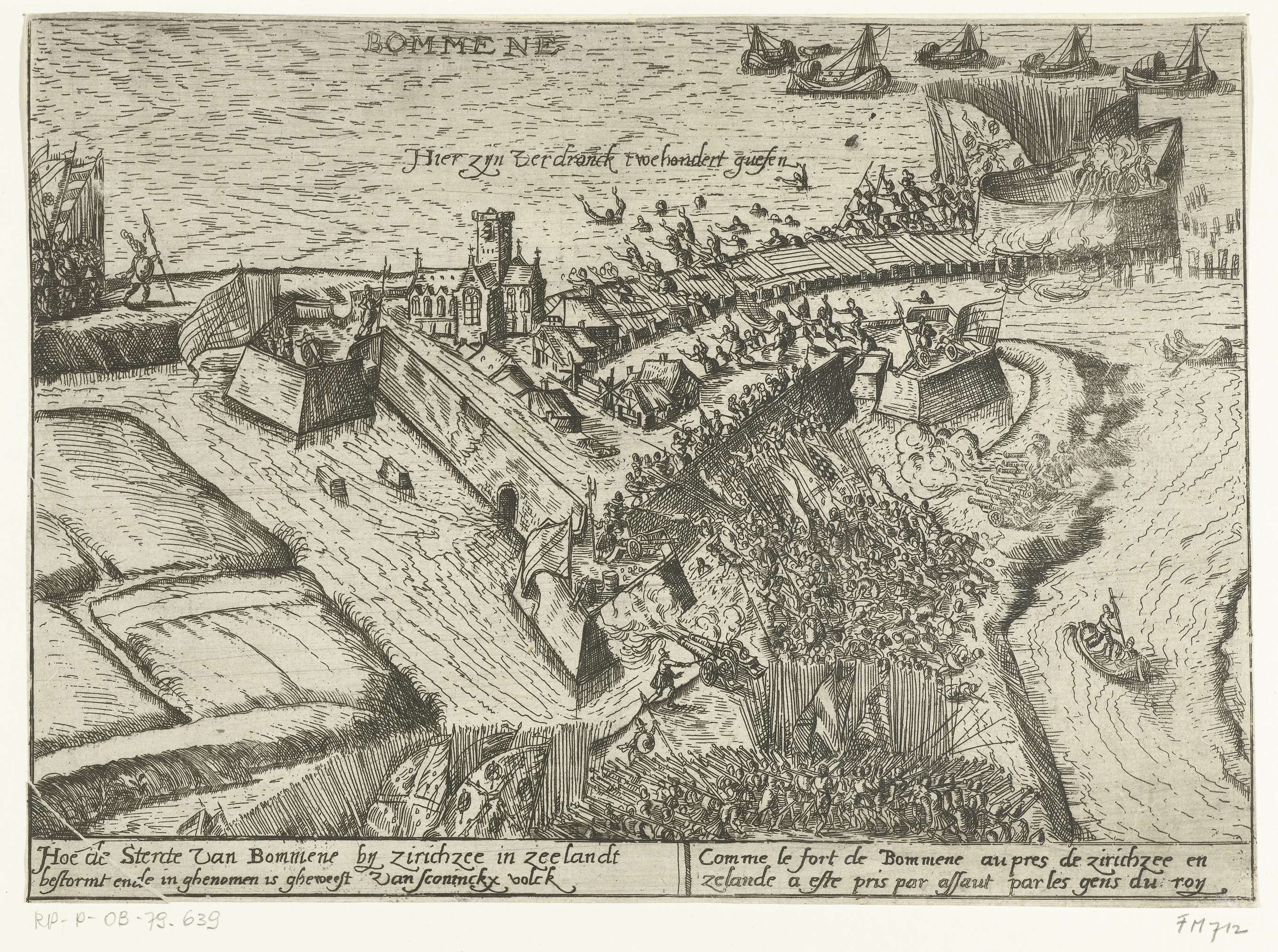 Het versterkte stadje Bommenede op het eiland Schouwen in Zeeland belegerd, ingenomen en uitgemoord door de Spanjaarden, 29 september 1575. Met onderschrift van 2 regels in het Nederlands en 2 regels in Frans.