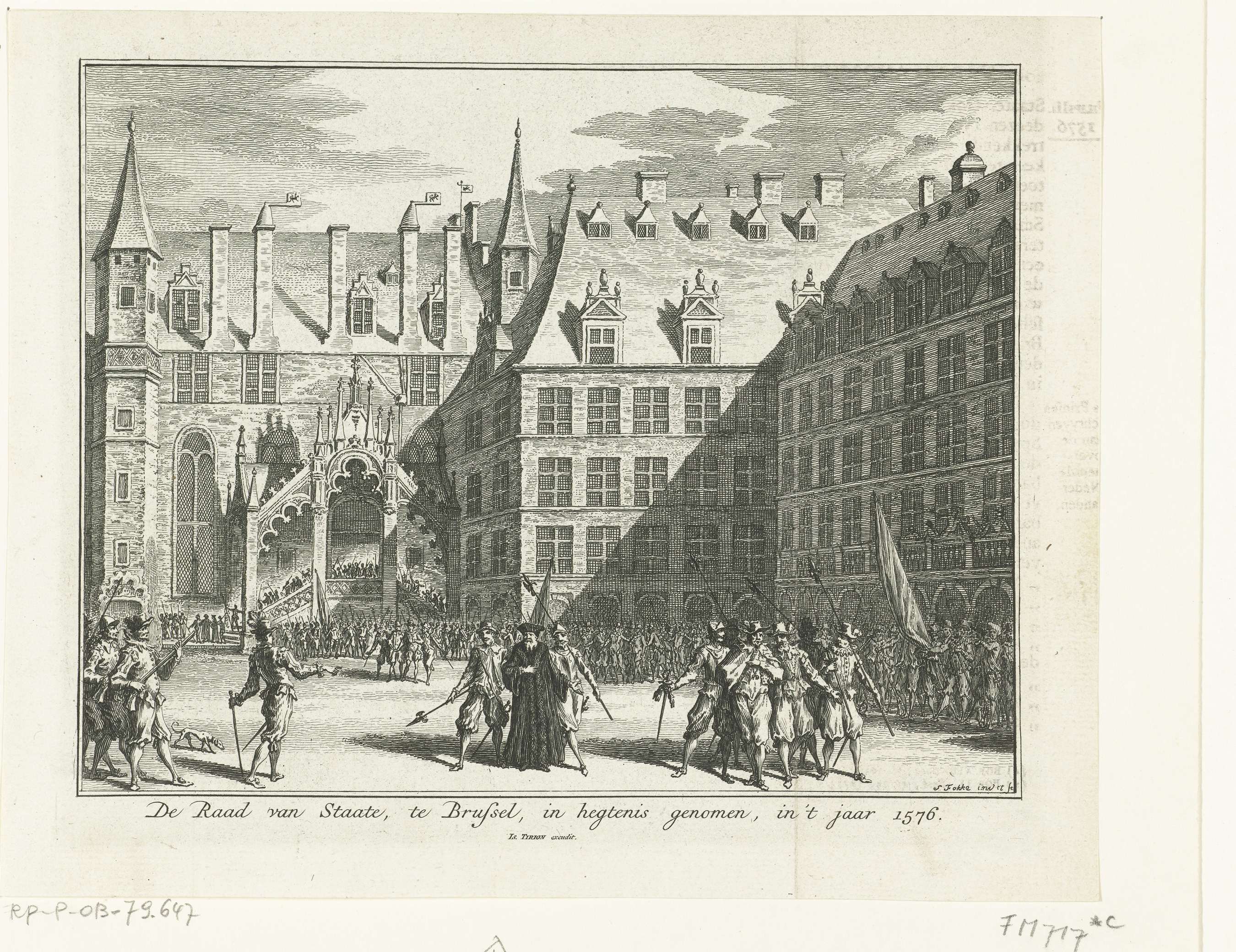 De leden van de Spaansgezinde Raad van State worden in Brussel gevangengenomen, 5 september 1576. Soldaten voren de leden van de Raad weg. Hiertoe behoren: Van Mansfeld, Berlaymont, Viglius en Del Rio.