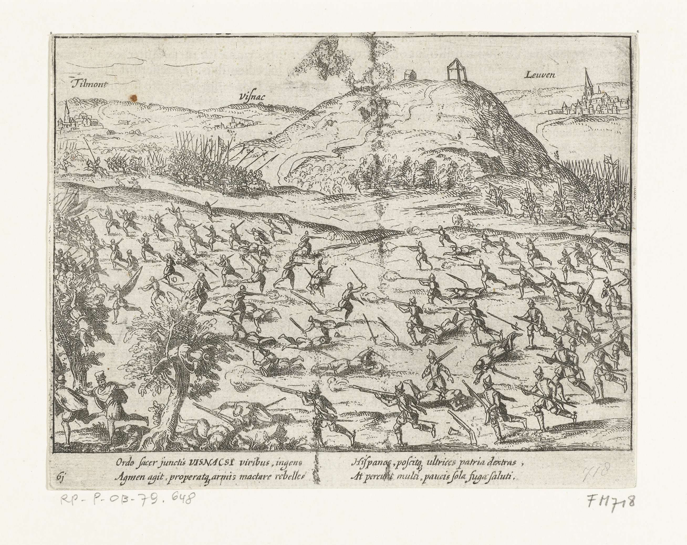 Slag bij Tienen, september 1576. Gezicht op de veldslag tussen Spaanse leger onder Vargas en Mendoza en het Staatse leger. Linksonder vinden ook studenten en burgers uit Leuven hierbij de dood. Rechts in de verte de stad Tienen, links Roosbeek. Met onderschrift van 4 regels in het Latijn. Genummerd: 61. Bedrukt op achterzijde met tekst ...