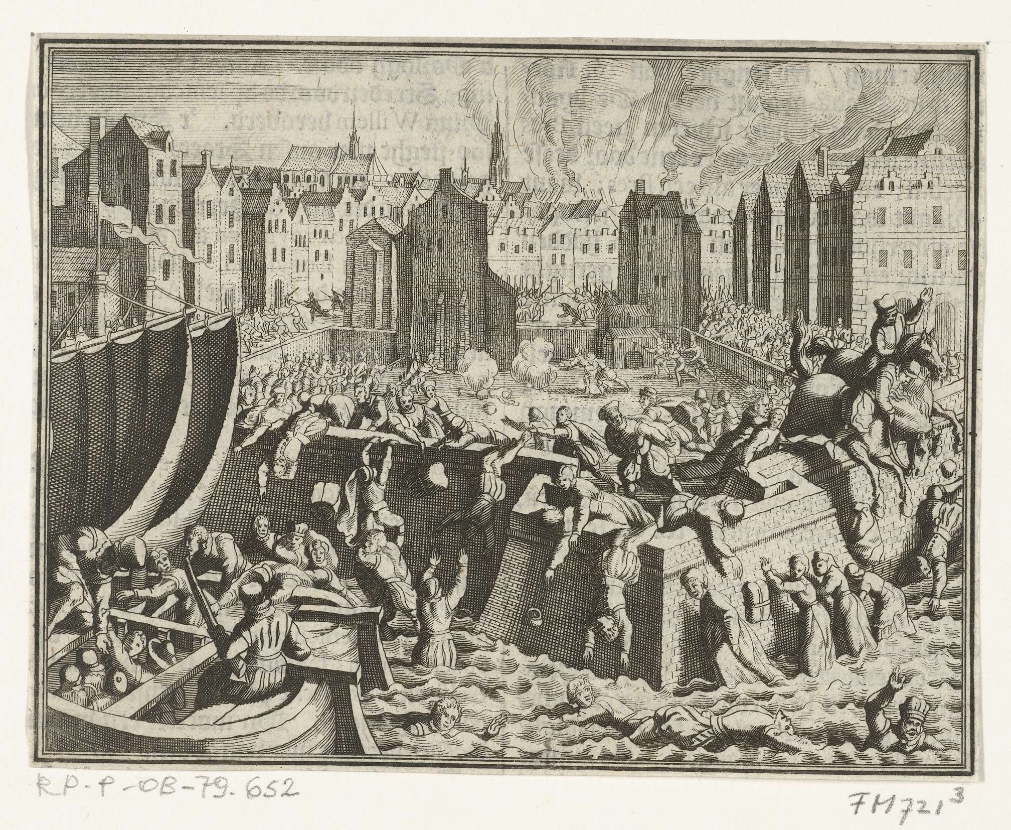 Spaanse Furie te Antwerpen, 4-7 november 1576. In een poging aan het geweld te ontsnappen springen Antwerpenaren in de Schelde en proberen te vluchten in bootjes. Bedrukt op achterzijde met tekst in het Nederlands.