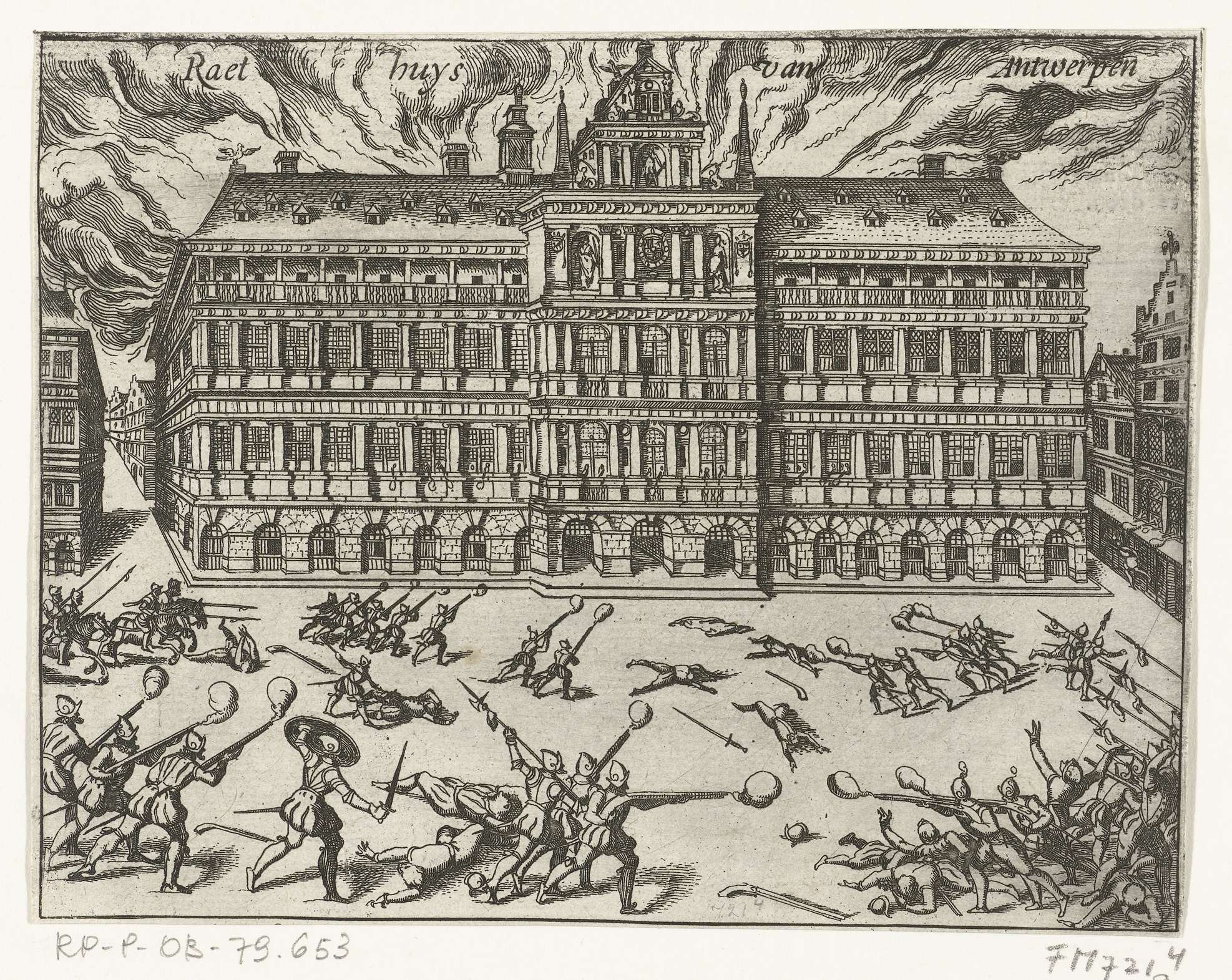 Spaanse Furie te Antwerpen, 4-7 november 1576. Het stadhuis van Antwerpen in brand. Op de Grote Markt voor het stadhuis gevechten tussen soldaten. Marge met onderschrift en nummer afgesneden. Bedrukt op achterzijde met tekst in het Nederlands en fragment van de voorstelling met de beschieting van de stad.