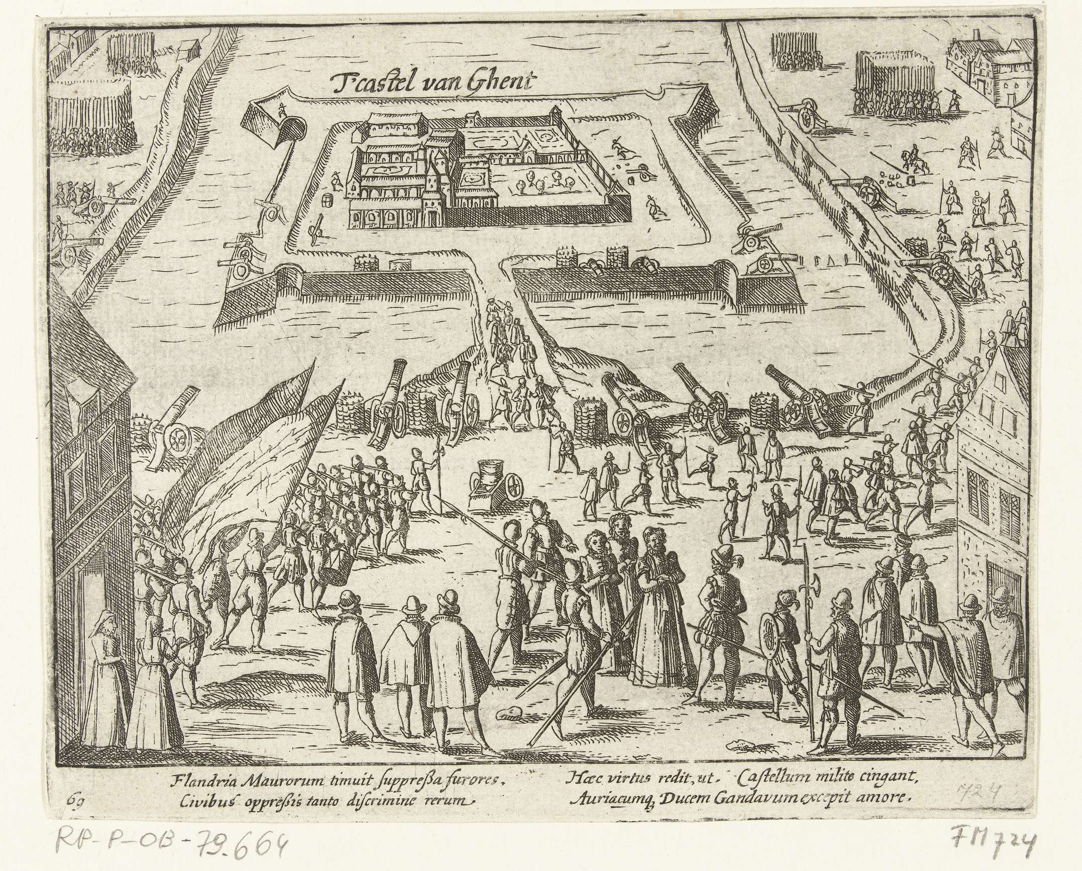 Aftocht van de Spanjaarden onder vrijgeleide uit de citadel van Gent na beleg door het Staatse leger, 9 november 1576. Op de voorgrond de vrouw van de Spaanse legeraanvoerder Mondragon. Met onderschrift van 4 regels in het Latijn. Genummerd: 69. Bedrukt op achterzijde met tekst in het Latijn.