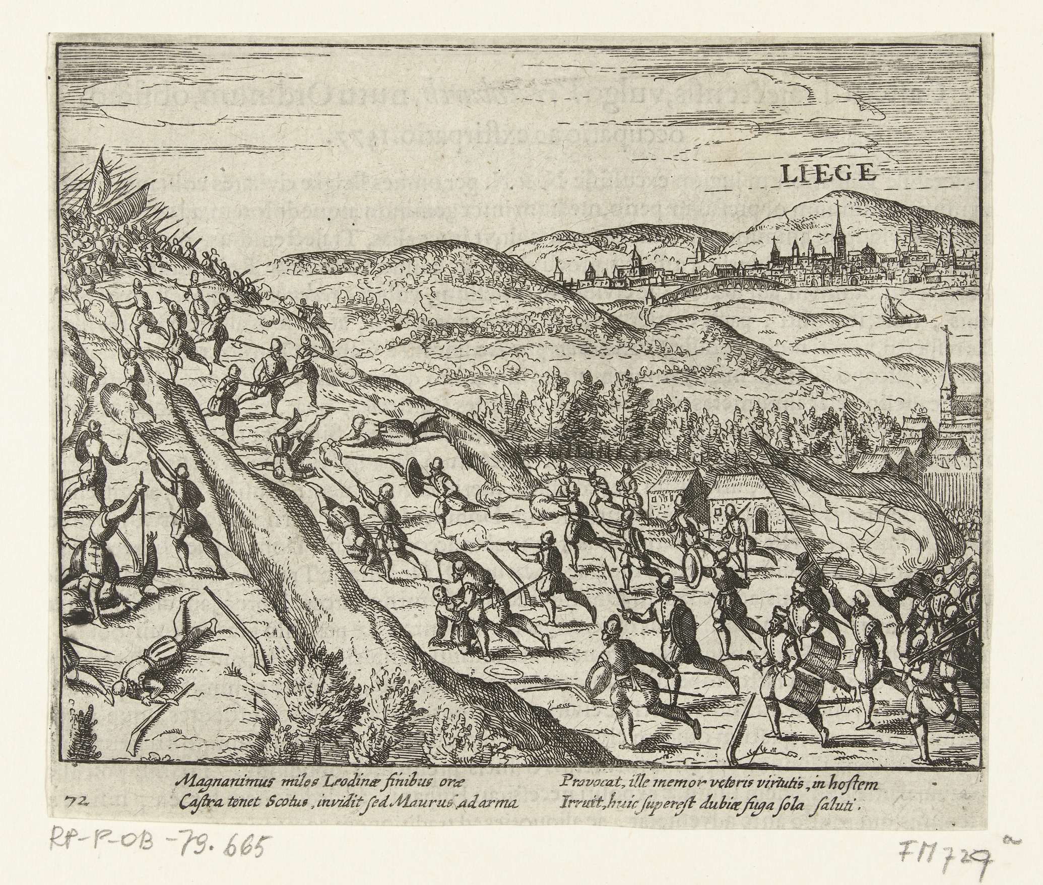 Spanjaarden door de Schotten verslagen en verjaagd tijdens een veldslag bij Luik, januari 1577. Met onderschrift van 4 regels in het Latijn. Genummerd: 72. Bedrukt op achterzijde met tekst in het Latijn.