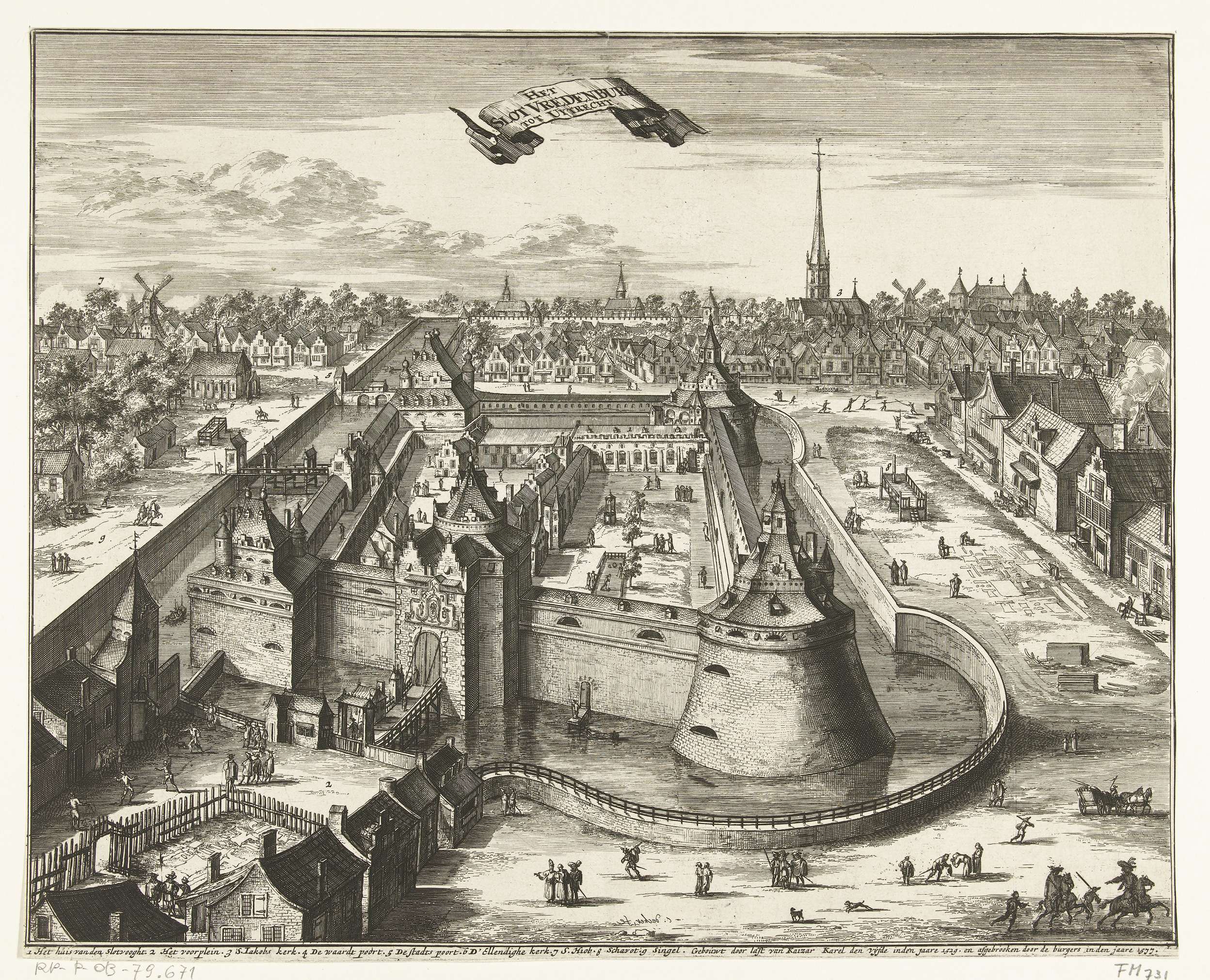 Gezicht op het Slot Vredenburg te Utrecht in welstand, vóór het beleg en het slechten in 1577. In het onderschrift de legenda 1-8 in het Nederlands.