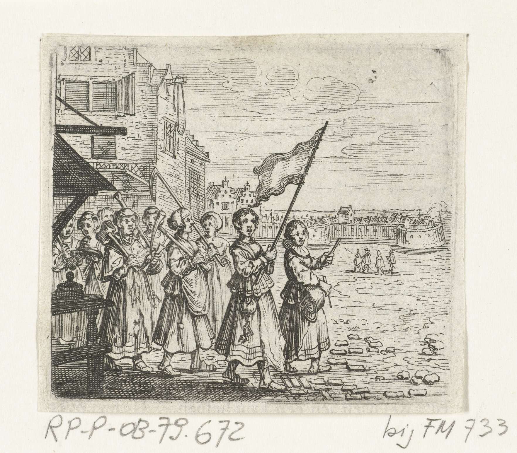Trijn van Leemput trekt met een groepje vrouwen gewapend met hamers en pikhouwelen op naar het kasteel Vredenburg, 2 mei 1577. Voorop een vrouw met een vlag en een vrouw die op een ketel slaat, op de achtergrond het belegerde kasteel. Illustratie uit een boek geknipt, bedrukt op achterzijde met tekst in het Nederlands.