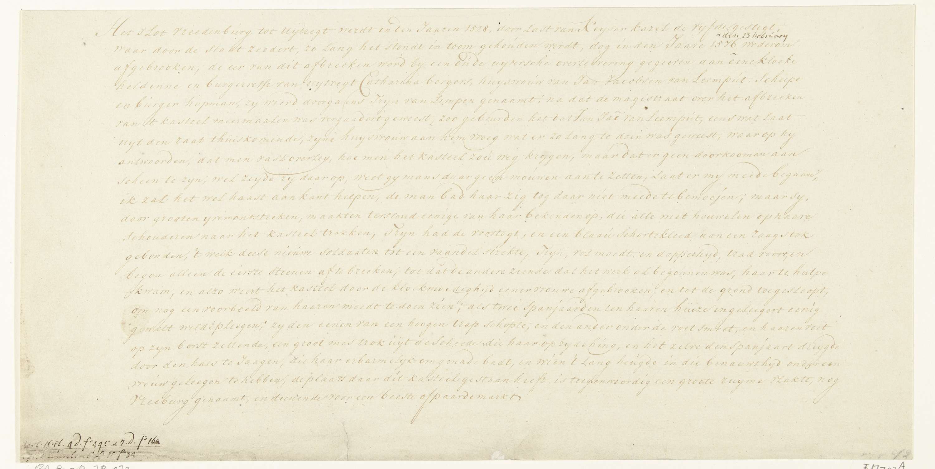Tekst over Trijn van Leemput en de slechting van kasteel Vredenburg, 2 mei 1577. Wellicht een afschrift van het manuscript in de Koninklijke Bibliotheek dat vermeld wordt door Muller.