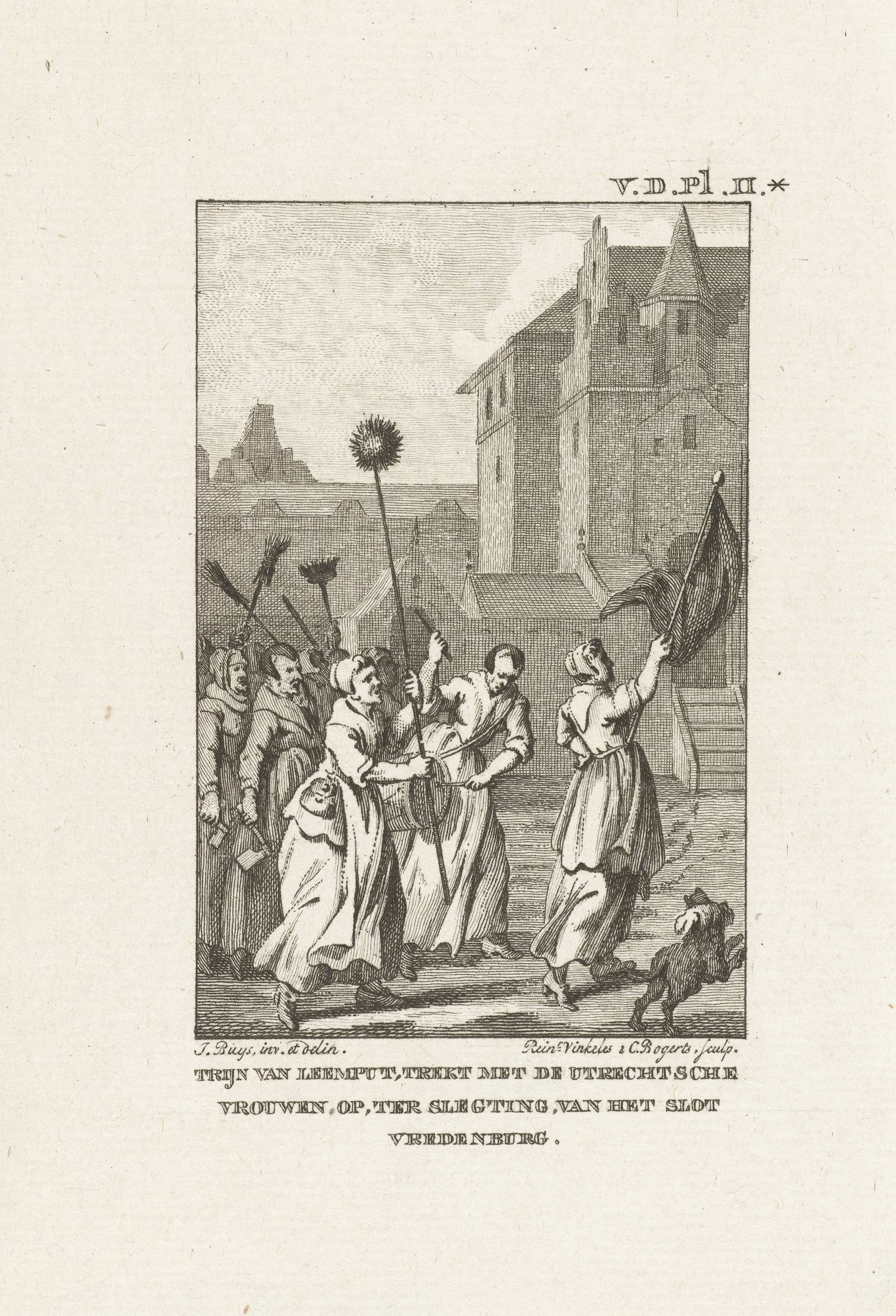 Trijn van Leemput trekt met een groepje vrouwen gewapend met hamers en pikhouwelen op naar het kasteel Vredenburg, 2 mei 1577. Voorop loopt een vrouw met een vlag, daarachter een vrouw die op een trom slaat en een vrouw met een ragebol.