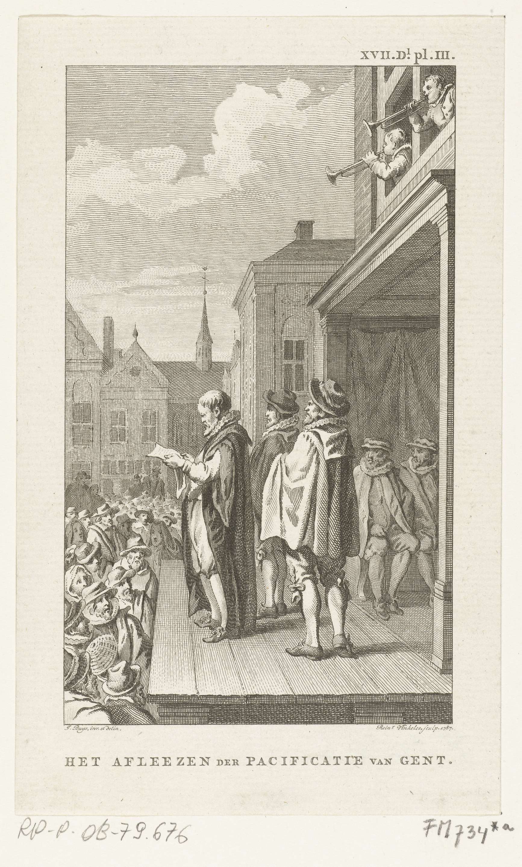Bekendmaking van het ondertekenen van de Pacificatie van Gent op 8 november 1576. Op een stellage wordt aan het aanwezige publiek de vrede bekend gemaakt en voorgelezen. Uit de ramen blazen twee mannen op bazuinen.