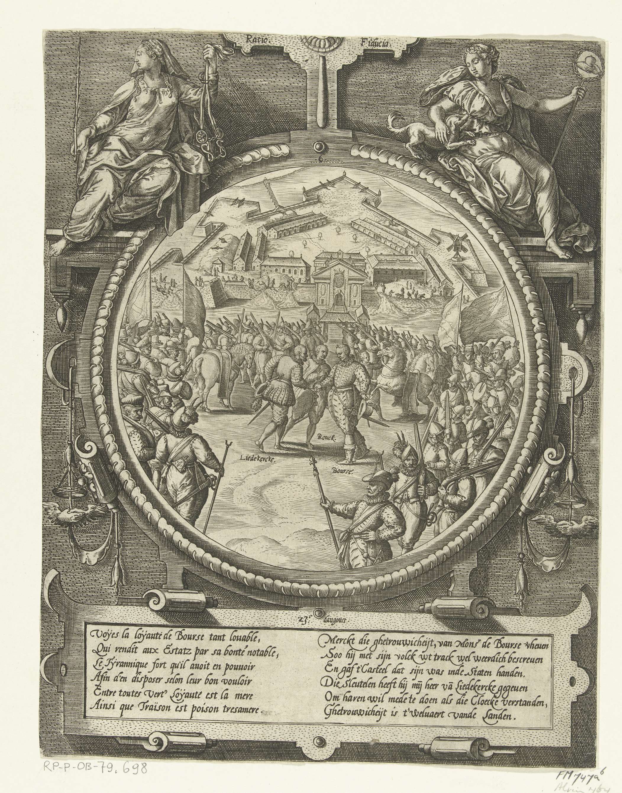De sleutels van de citadel worden door Bourse overgedragen aan Liedekercke, 23 augustus 1577. Liedekercke, Bourse en Roeck omringd door soldaten, op de achtergrond de citadel. Voorstelling in een rond medaillon met ornamentele allegorische omlijsting met bovenaan de zittende vrouwelijke personificaties van Rede (Ratio) en Trouw (Fiducia). Onderaan een cartouche met 2 verzen van elk ...