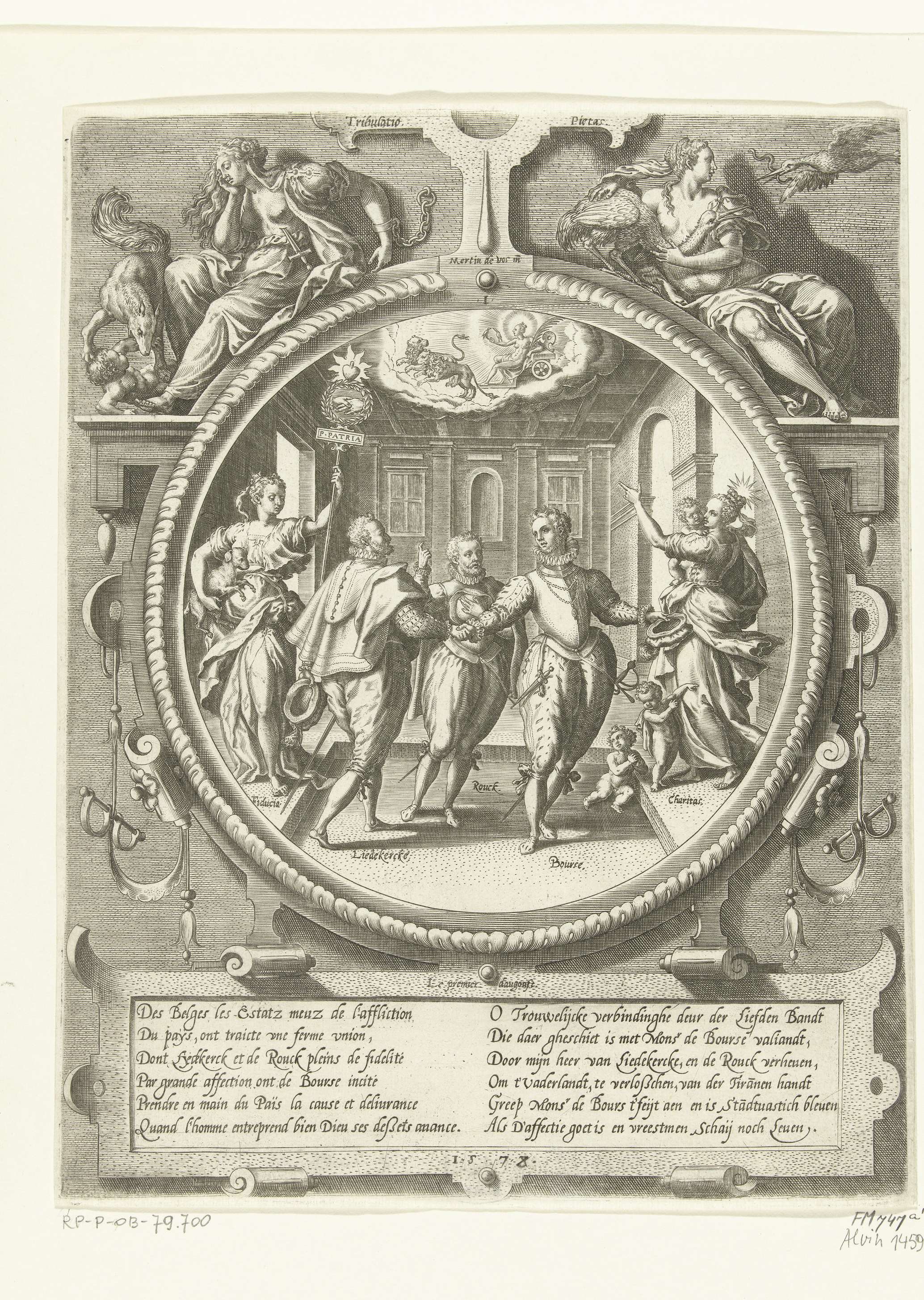 Het verbond tussen Liedekercke, Roeck en Bourse, om de Citadel van Antwerpen te veroveren, 1 augustus 1577. Interieur waarin de drie mannen een eed afleggen. Links Trouw (Fiducia) en Liefde (Charitas), in de wolken de triomfwagen van Venus. Voorstelling in een rond medaillon met ornamentele allegorische omlijsting met bovenaan de zittende vrouwelijke personificaties van Kwelling ...