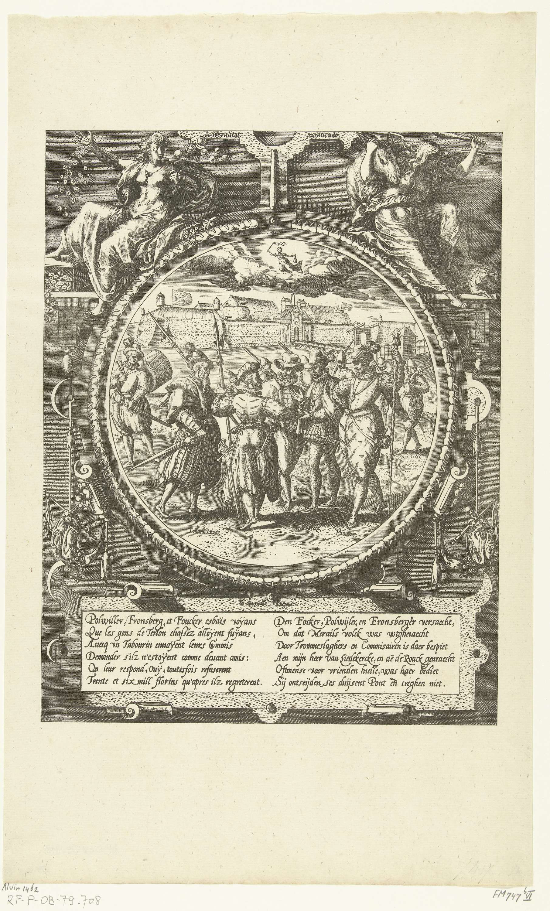 Reproductie van de prent met de onderhandelingen tussen Liedekercke, Roeck en Bourse en de Duitse commandanten over een afkoopsom voor het vertrek van het Duitse garnizoen, 2 augustus 1577. Groep mannen staande in overleg, op de achtergrond de citadel. In de wolken de personificatie van Gods bestraffing. Voorstelling in een rond medaillon met ornamentele allegorische ...