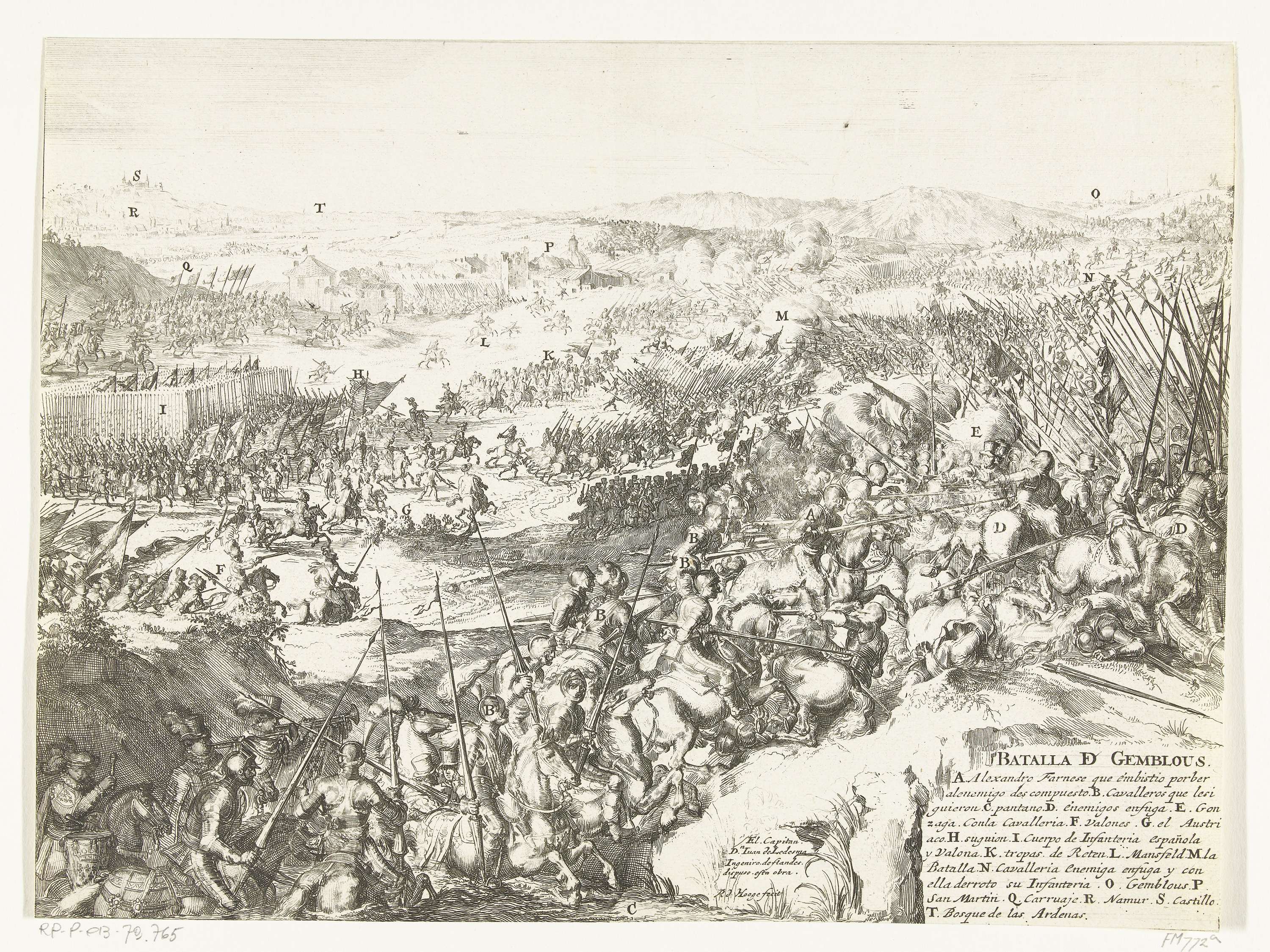 Slag bij Gembloers, 31 januari 1578. Veldslag waarbij het Staatse leger verslagen wordt door het leger van Farnese. In de verte links de stad Namen. Op de voorgrond trekken ruiters door een water naar het slagveld. Rechtsonder een cartouche met de titel en de legenda A-T in het Spaans.