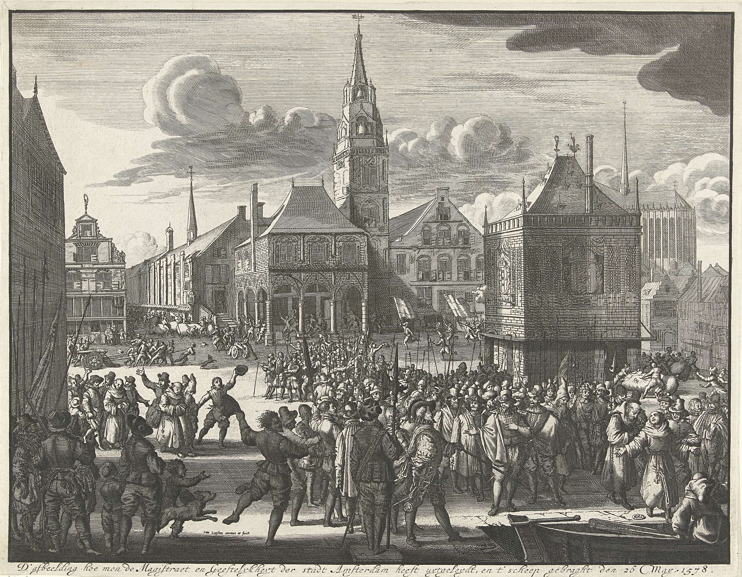 Alteratie van Amsterdam, 26 mei 1578. Het Spaansgezinde stadsbestuur en de roomse geestelijkheid worden gedwongen te vertrekken, op de kade bij de Dam stappen zij in gereed staande boten.