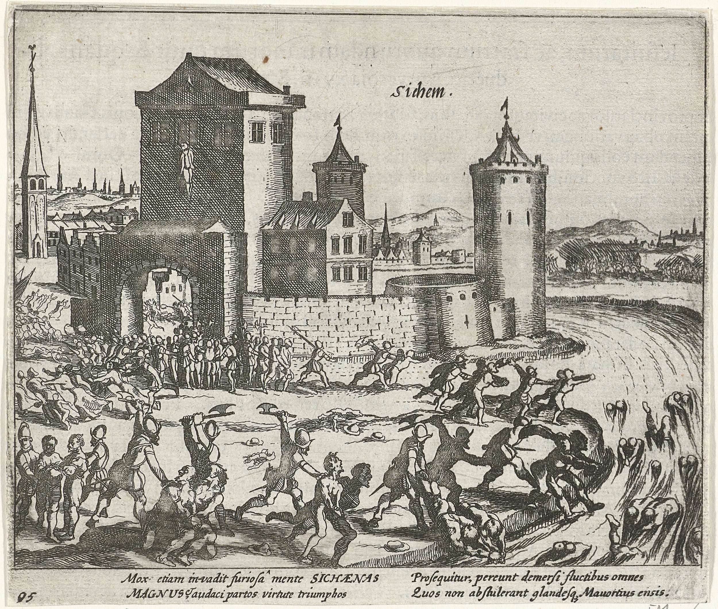 Verovering en bestraffing van het plaatsje Zichem door de troepen van de hertog van Parma, 21 februari 1578. Buiten de stadspoort wordt een groot aantal burgers gedood en hun lichamen in de rivier gegooid. In de verte de stad Diest. Met onderschrift van 4 regels in het Latijn. Genummerd: 95. Bedrukt op achterzijde met tekst ...
