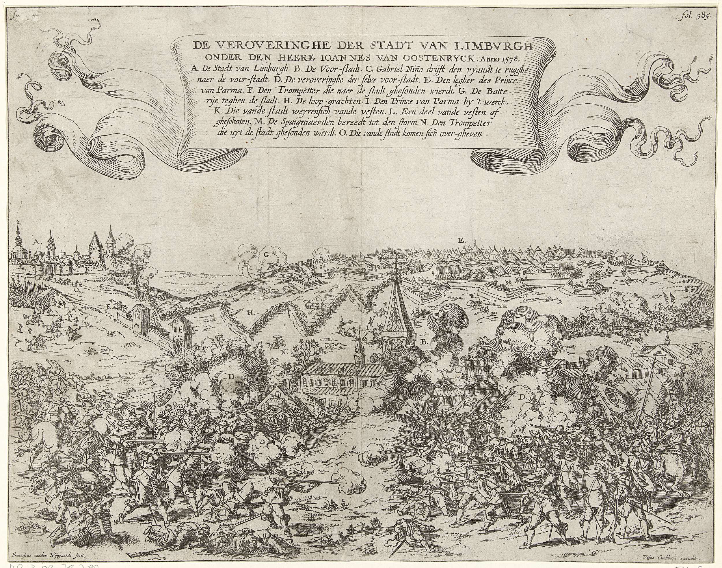 Verovering van de stad Limburg in Duitsland door het leger van Parma, mei 1578. Op de voorgrond de veldslag, daarachter het legerkamp van de hertog van Parma, links in de verte de stad Limburg. Bovenin een banderol met de titel en legenda A-O in het Nederlands.