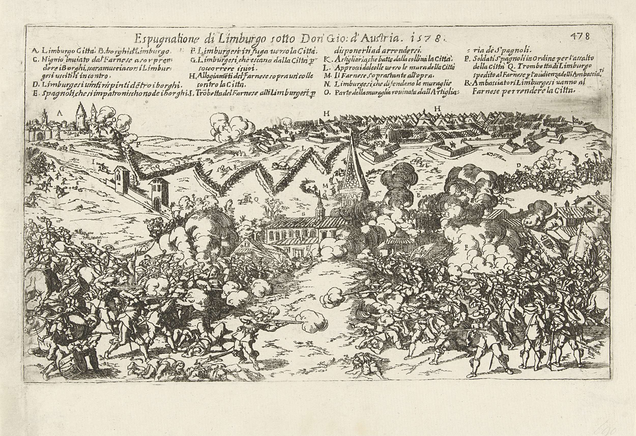 Verovering van de stad Limburg in Duitsland door het leger van Parma, mei 1578. Op de voorgrond de veldslag, daarachter het legerkamp van de hertog van Parma, links in de verte de stad Limburg. Bovenaan de legenda A-R in het Italiaans.