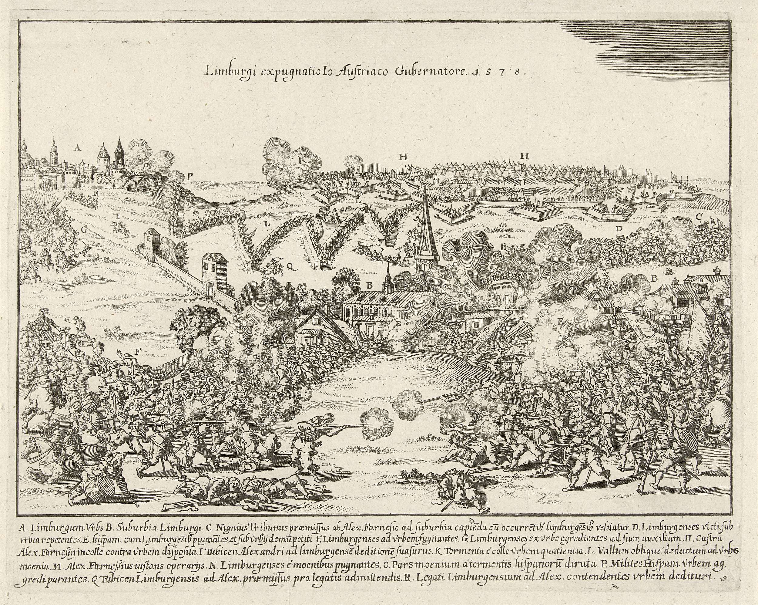 Verovering van de stad Limburg in Duitsland door het leger van Parma, mei 1578. Op de voorgrond de veldslag, daarachter het legerkamp van de hertog van Parma, links in de verte de stad Limburg. In het onderschrift de legenda A-R in het Latijn.