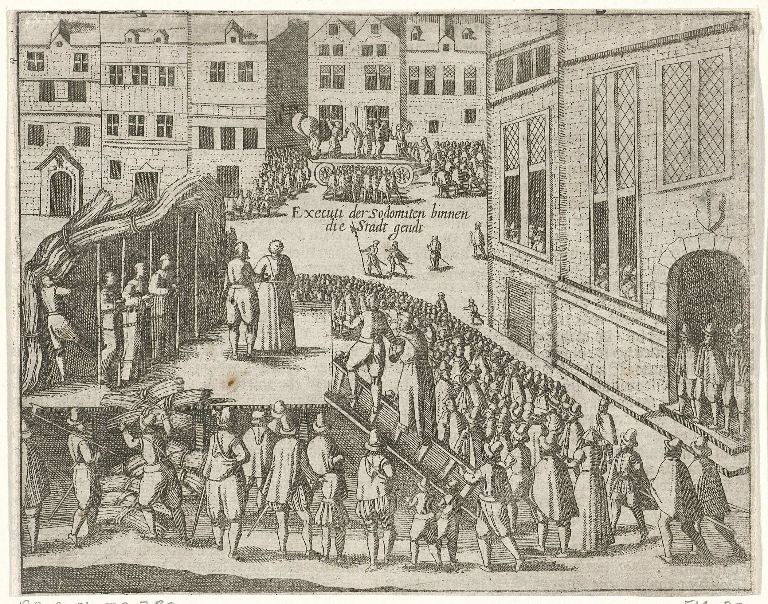 Geseling en terechtstelling van vier franciscaner monniken te Gent op beschuldiging van sodomie, 28 juni 1578. Op de achtergrond de geseling, op de voorgrond de monniken op de brandstapel. De marge met onderschrift en nummer afgesneden. Bedrukt op achterzijde met tekst in het Nederlands.