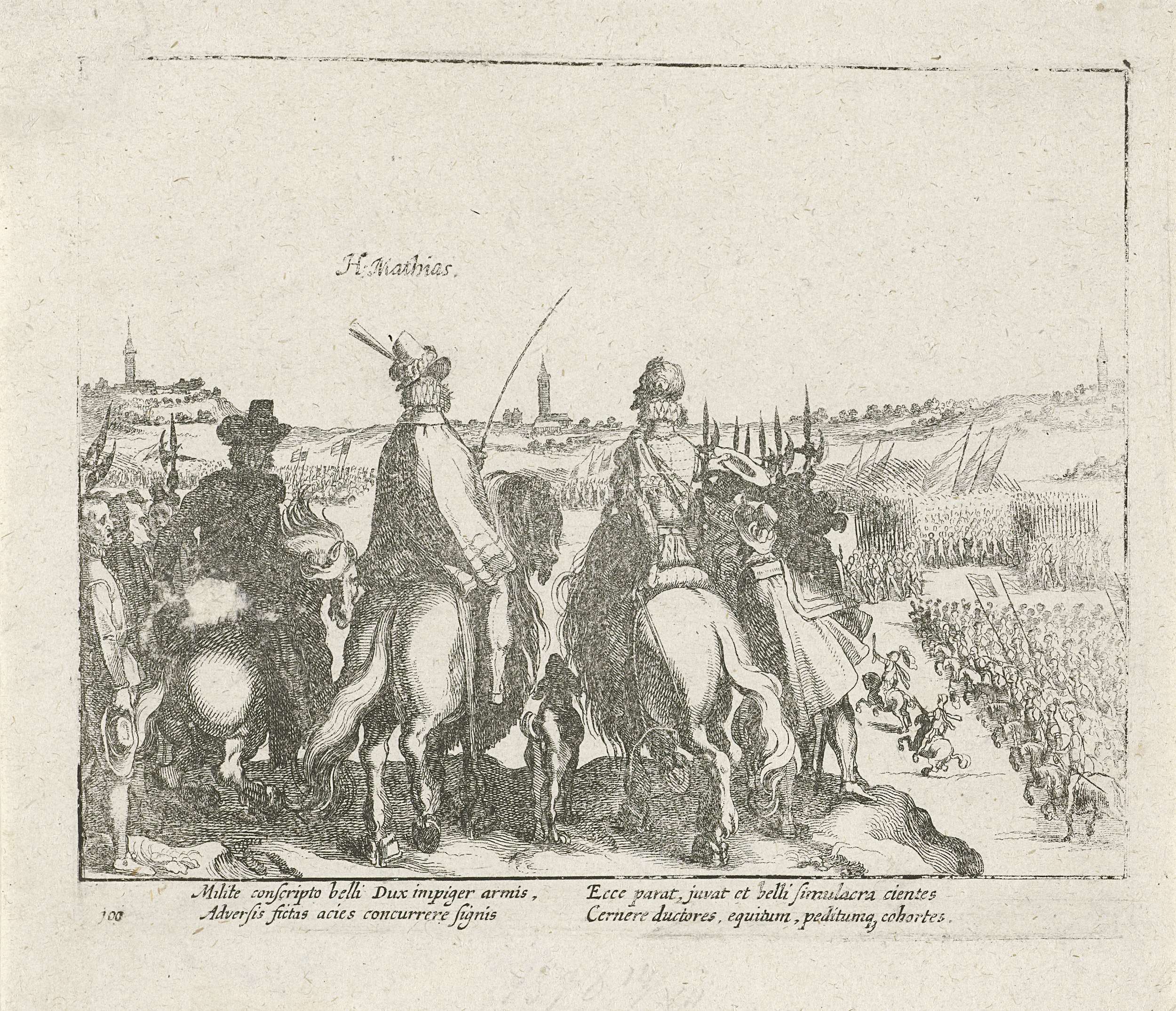 Aartshertog Matthias van Oostenrijk en de prins van Oranje houden revue over het Staatse leger in het veld gebracht tegen Don Juan, 14 juli 1578. De beide vorsten te paard, op de rug gezien. Met onderschrift van 4 regels in het Latijn. Genummerd: 100. Onbedrukt op achterzijde.