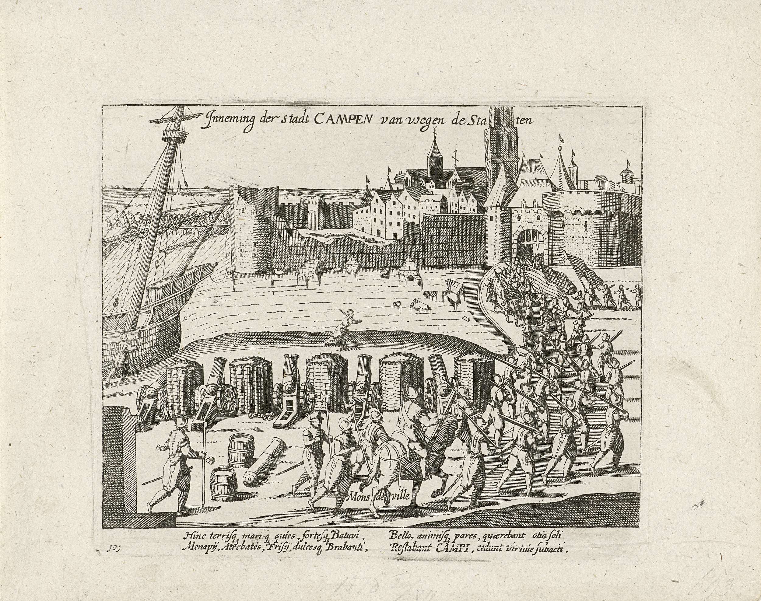 Inname van Kampen na beleg door Staatse troepen onder Rennenberg, 20 juli 1578. Op de achtergrond vertrekt het Duitse garnizoen uit de stad. Met onderschrift van 4 regels in het Latijn. Genummerd: 101. Onbedrukt op achterzijde.
