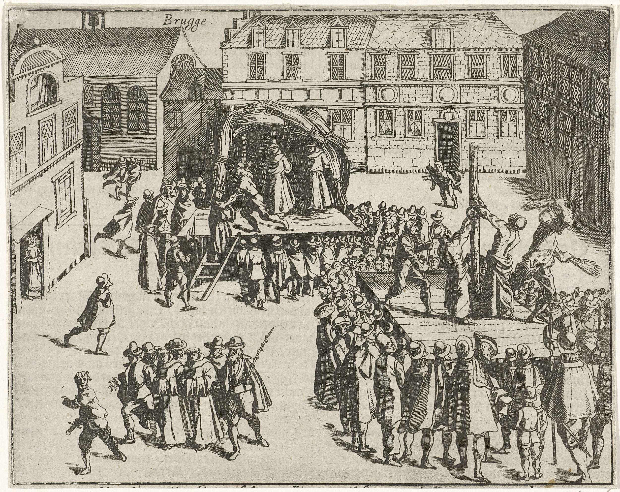 Geseling en terechtstelling van de franciscaner monniken te Brugge op beschuldiging van sodomie, 26 juli 1578. Rechts de geseling, links de monniken op de brandstapel. Bedrukt op achterzijde met tekst in het Nederlands.