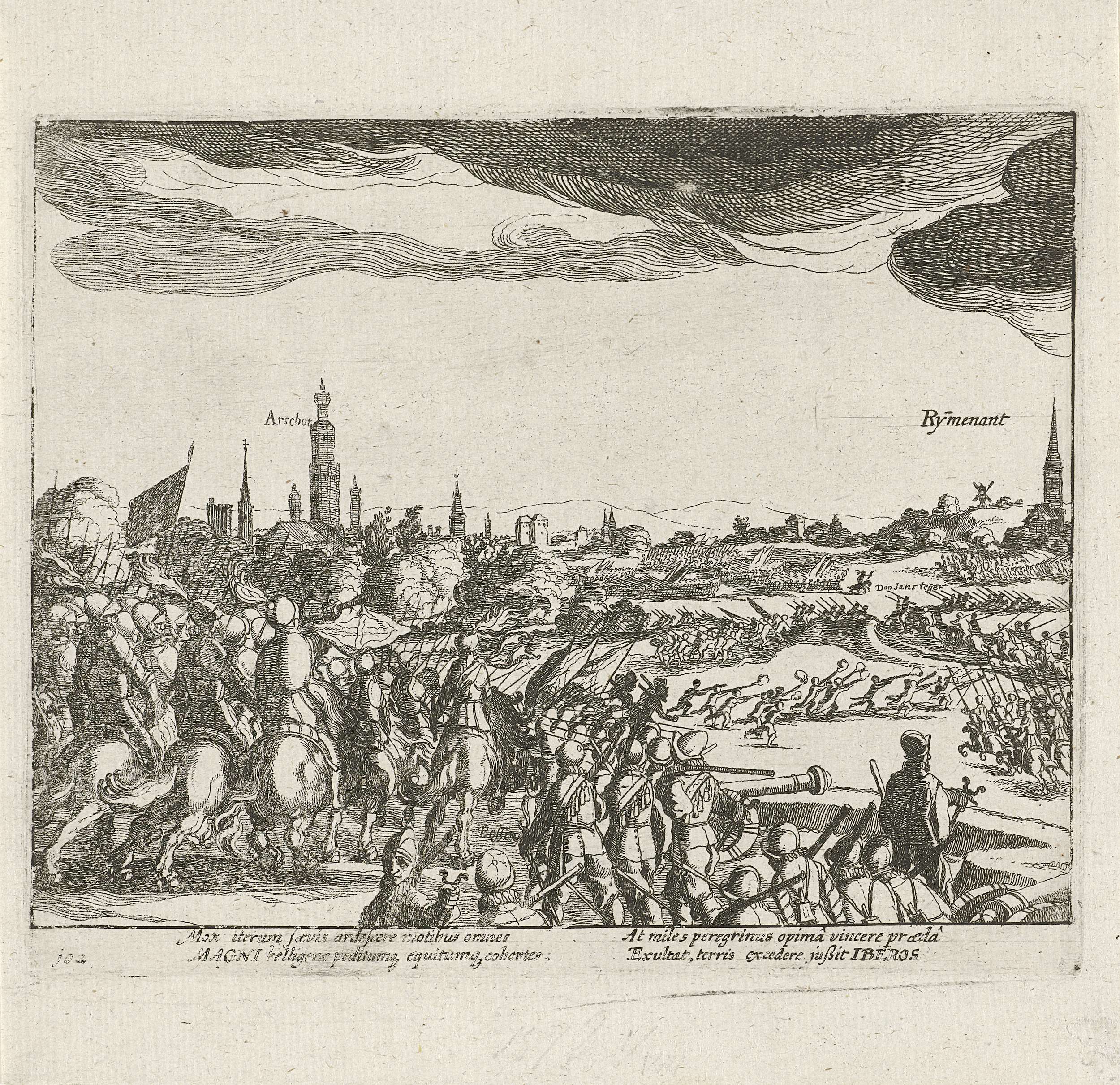 Veldslag bij Rijmenam tussen het Staatse leger onder Bossu en de troepen van Don Juan, 1 augustus 1578. In de verte de plaatsen Aarschot en Rijmenam. Met onderschrift van 4 regels in het Latijn. Genummerd: 102. Onbedrukt op achterzijde.