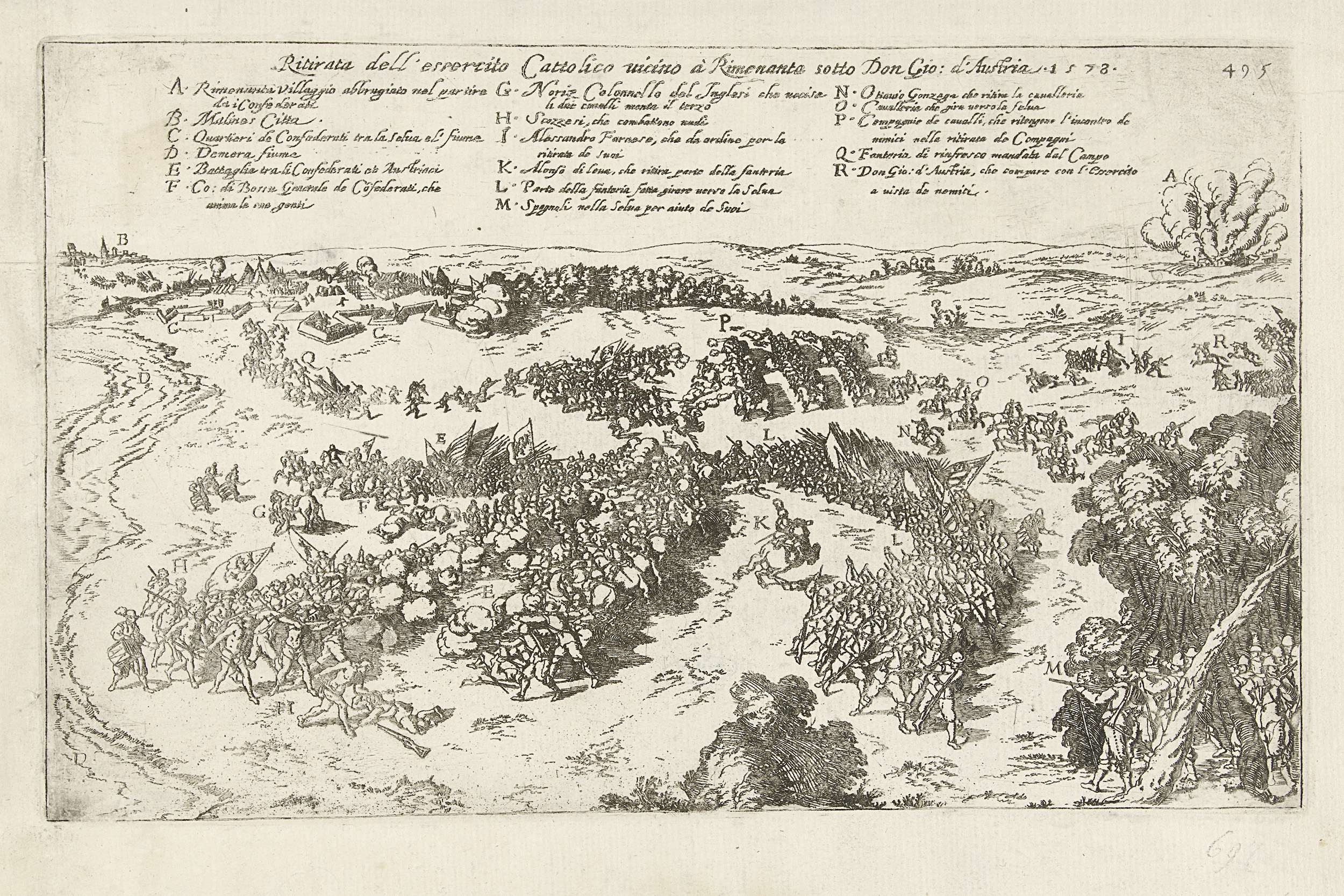 Veldslag bij Rijmenam tussen het Staatse leger onder Bossu en de troepen van Don Juan en Parma, 1 augustus 1578. Op de voorgrond de veldslag, links in de verte de Mechelen. Bovenin de titel en legenda A-R in het Italiaans.