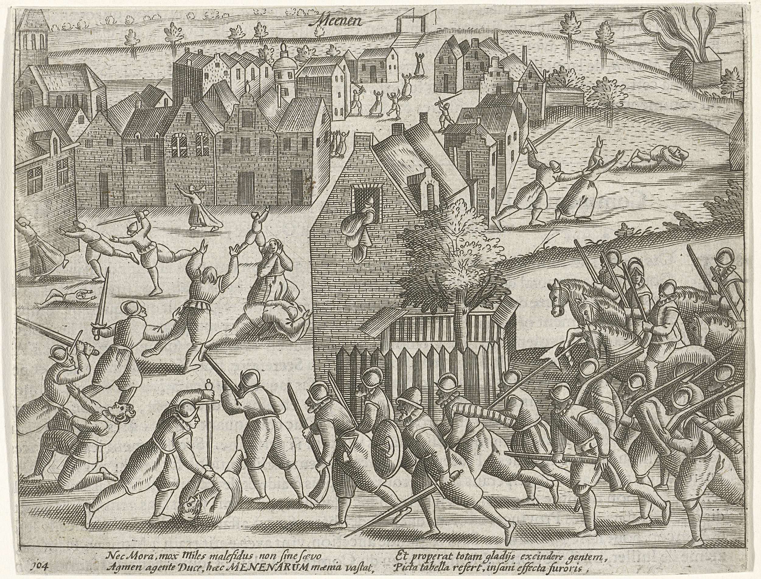 Het stadje Menen veroverd door de Malcontenten, 24 september 1578. Gezicht in de straten waar gevochten wordt. Met onderschrift van 4 regels in het Latijn. Genummerd: 104. Bedrukt op achterzijde met tekst in het Frans.