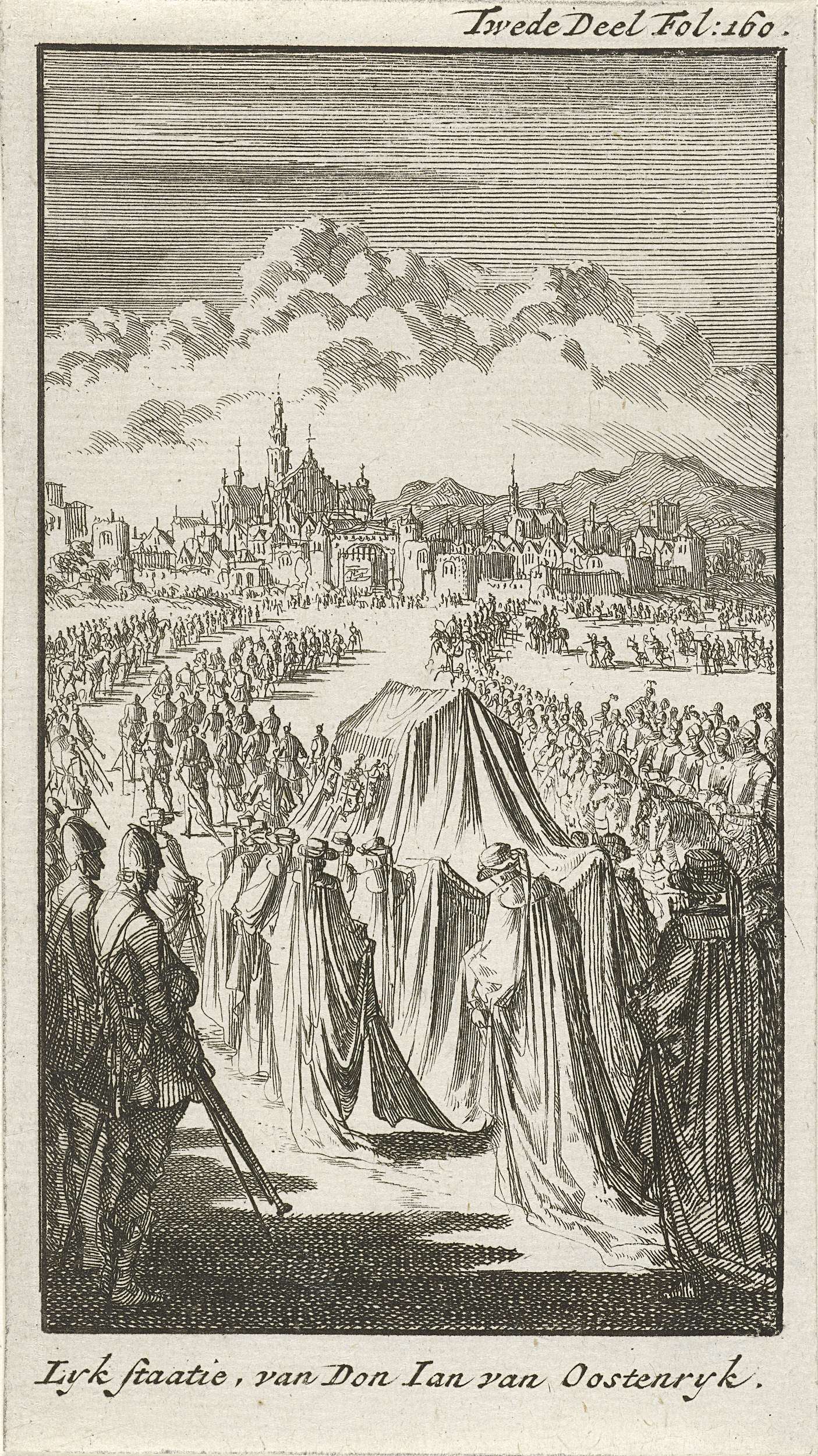 Lijkstatie van de aan de pest overleden Don Juan van Oostenrijk, 1 oktober 1578. De lijkstoet trekt over een plein in de richting van een kerk.