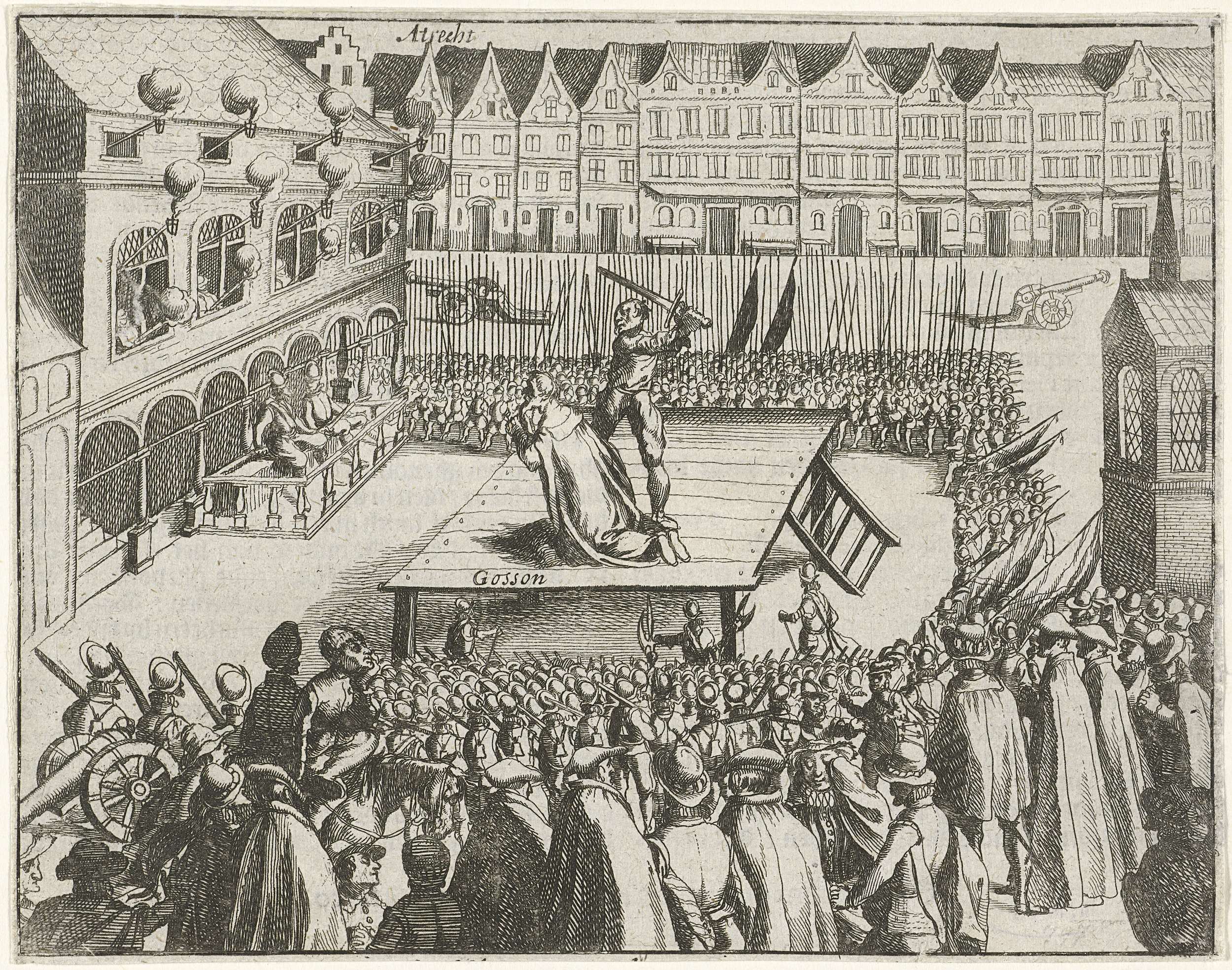 Onthoofding van de raadsheer Nicolas Gosson te Atrecht, wegens sympathie met de Malcontenten, 26 oktober 1578. Gosson knielt op het schavot op een plein. Bedrukt op achterzijde met tekst in het Nederlands.